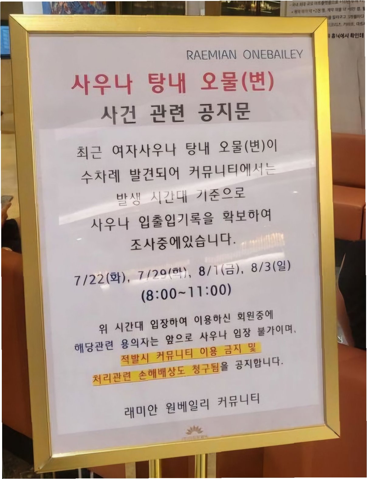 고급 아파트에서 벌어진 믿기 힘든 사건서울 서초구 반포동에 위치한 래미안 원베일리 아파트 여자 사우나에서 오물이 발견되어 충격을 주고 있습니다. 온라인 커뮤니티를 통해 사건이 알려지면서, 초고가 아파트에서 벌어진 믿기 힘든 사건에 많은 이들이 놀라움을 감추지 못하고 있습니다. 쾌적하고 고급스러운 환경을 제공해야 할 공간에서 발생한 이례적인 사건은 입주민들에게 큰 불안감을 안겨주고 있습니다. 사건의 전말: 반복된 오물 발견사건은 최근 래미안 원베일리 아파트 여자 사우나 탕 내에서 변이 여러 차례 발견되면서 시작되었습니다. 아파트 측은 긴급 공지를 통해 이 사실을 알리고, 사건의 심각성을 강조했습니다. 7월 22일부터 시작하여, 8시부터 11시 사이에 네 차례나 동일한 사건이 발생했습니다. 이러한 반복..