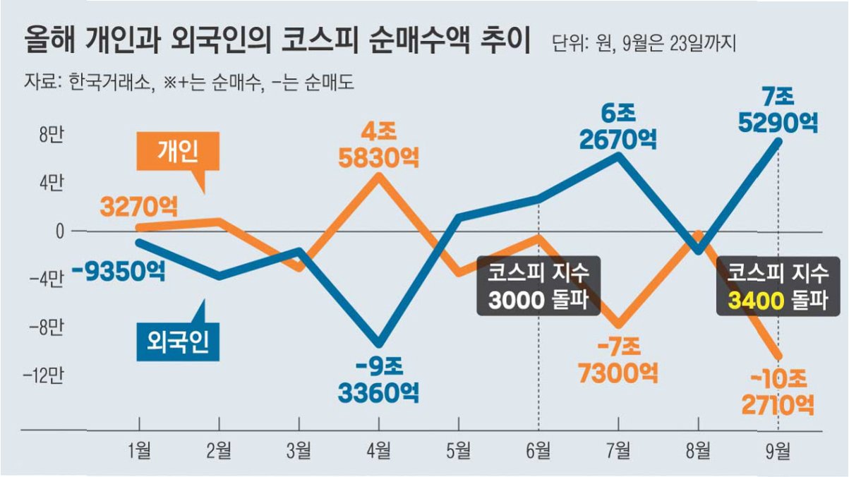 9월, 코스피는 연일 사상 최고치를 경신하며 뜨거운 불장을 연출했습니다. 그러나 이 화려한 랠리 뒤에는 개인 투자자들의 대규모 매도세가 자리 잡고 있었습니다. 한국거래소에 따르면, 개인 투자자들은 9월 한 달 동안 무려 9조 8900억원어치를 순매도했습니다. 이는 8월의 30억원 순매수에서 급격하게 전환된 모습으로, 시장의 뜨거운 열기 속에서도 차익 실현에 나선 개미들의 움직임을 보여줍니다.