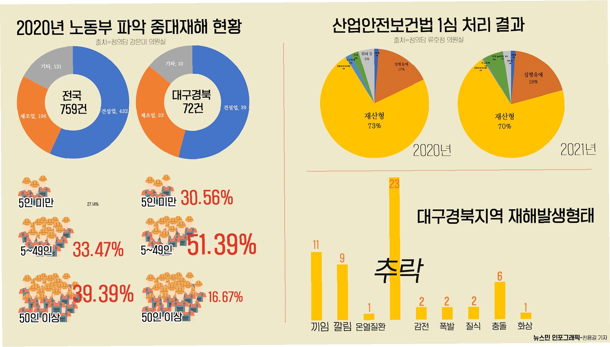 노동계는 중대재해법 시행 이후에도 산재 사고가 줄어들지 않는 이유로 솜방망이 처벌을 꼬집고 있다. 2020년부터 지난해 말까지 검찰이 기소한 중대재해법 사건 중 1심 선고가 내려진 것은 31건이며, 이 중 실형이 선고된 것은 4건에 불과하다. 솜방망이 처벌 때문에 중대재해법 처벌 이후에도 사고가 줄어들지 않고 있다는 지적이 나온다.