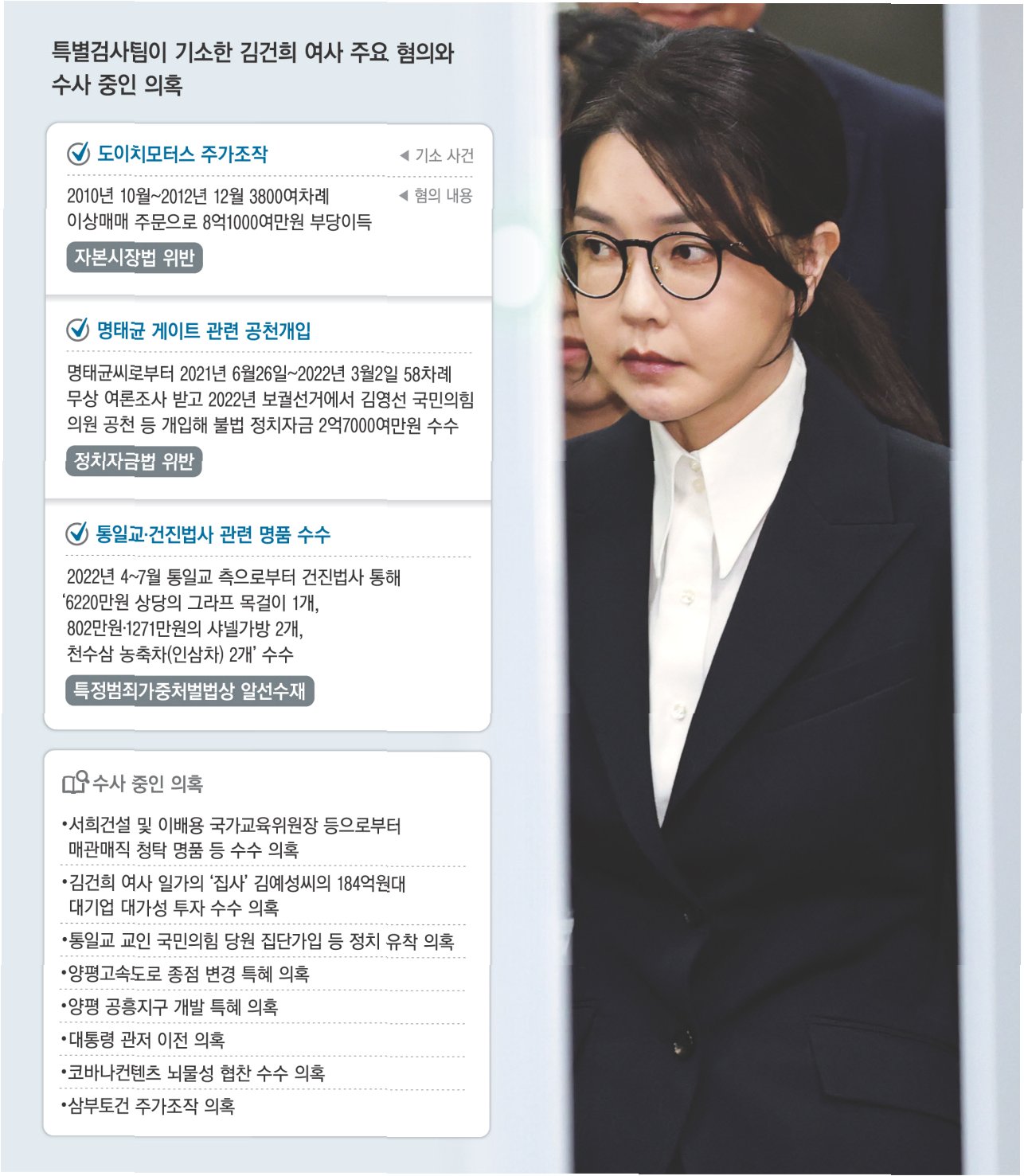 A.김건희 여사에게 샤넬백 등을 전달한 혐의, 권성동 의원에게 정치자금을 제공한 혐의 등을 수사하고 있습니다.