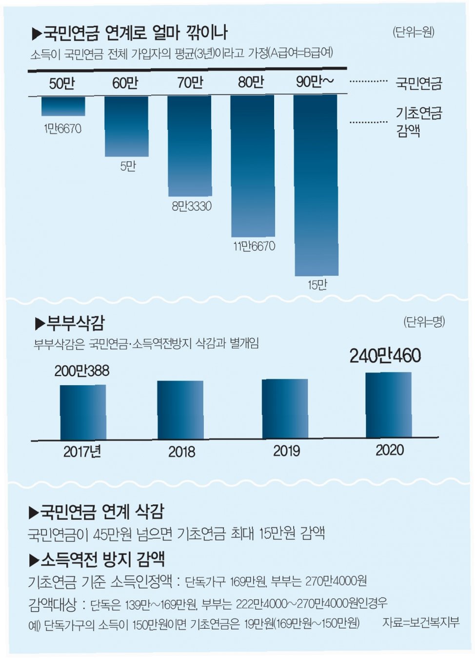 A.지난해 연계감액 기준은 국민연금 약 50만원이었습니다. 국민연금 수령액이 이 기준을 넘으면 기초연금이 감액됩니다.