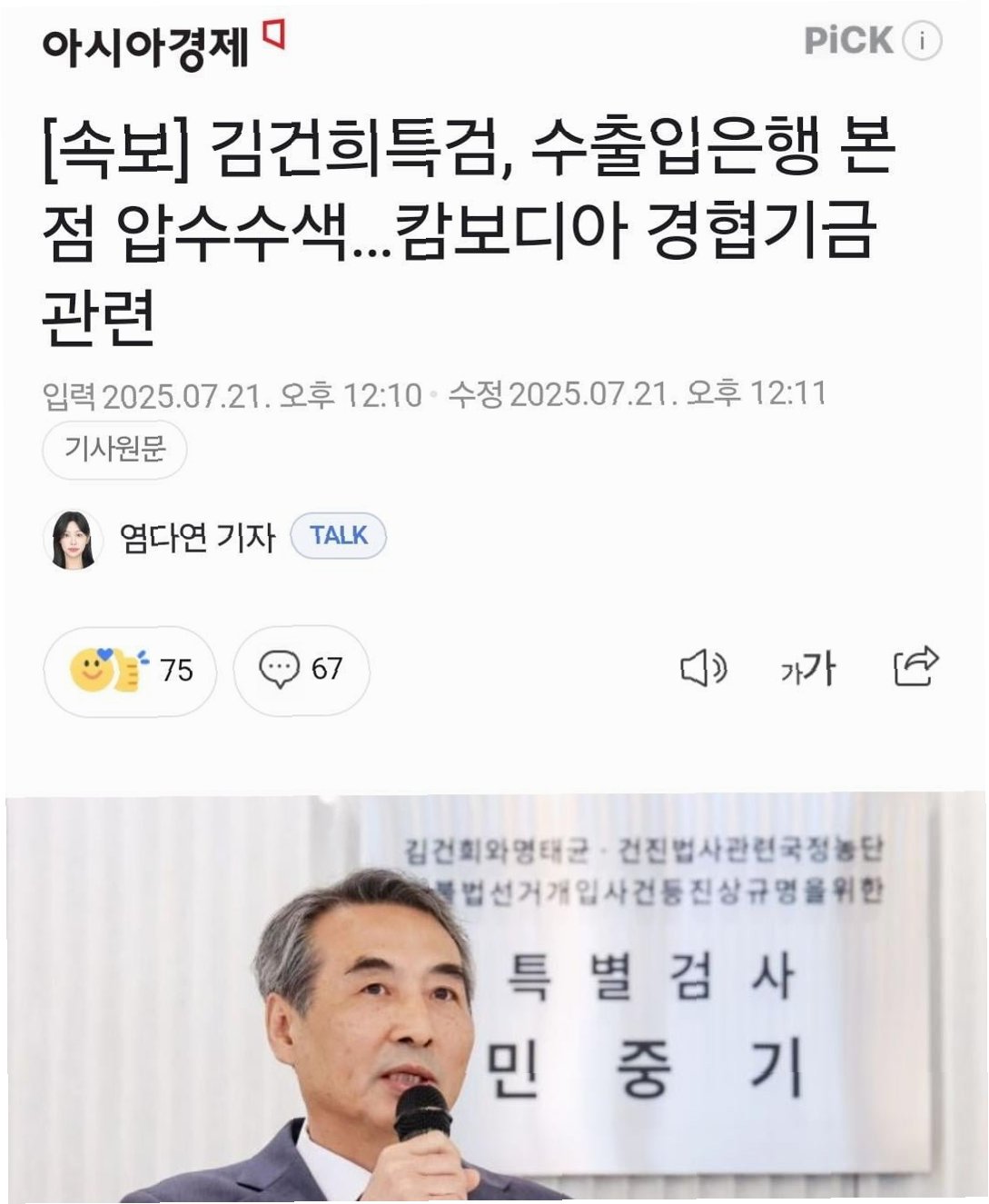 김건희 여사 관련 의혹을 수사하는 민중기 특별검사팀이 윤석열 전 정부의 캄보디아 경제협력 기금과 관련하여 수출입은행을 상대로 강제 수사에 나섰습니다. 이데일리 백주아 기자의 보도에 따르면, 특검팀은 21일 서울 영등포구의 수출입은행 본점에 수사 인력을 보내 PC 내 파일 등을 확보 중입니다. 이번 압수수색은 정부의 캄보디아 공적개발원조(ODA) 사업과 ‘건진법사 청탁 의혹’의 연관성을 조사하는 차원에서 이뤄졌습니다. 이는 김건희 여사와 관련된 의혹에 대한 수사가 더욱 확대될 가능성을 시사하며, 국민적 관심이 집중되고 있습니다.