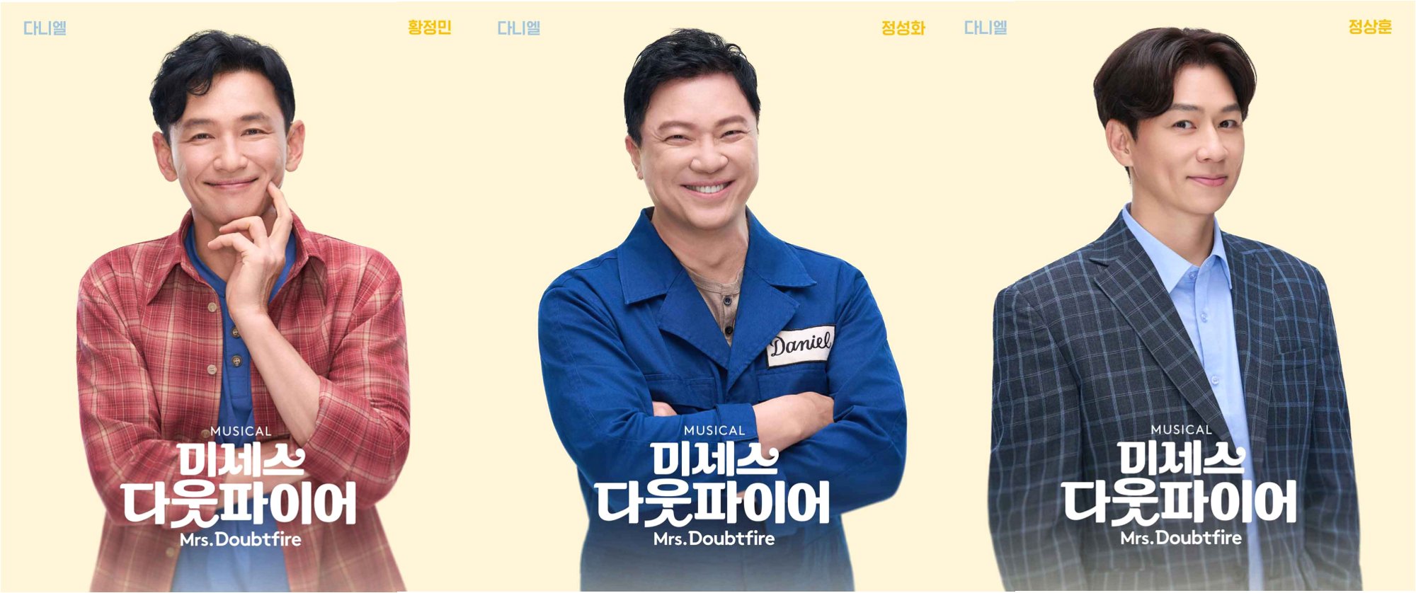 황정민은 뮤지컬 배우 정성화, 정상훈과 함께 다니엘 힐라드 역을 맡아 열연을 펼칩니다. 다니엘 힐라드는 실직한 성우이자 헌신적인 아버지의 모습으로, 세 배우는 각자의 개성을 살려 이 복잡한 캐릭터를 소화할 예정입니다. 특히 정성화는 2022년 초연에 이어 다시 한번 다니엘 힐라드 역을 맡아, 더욱 깊어진 연기를 선보일 것으로 기대됩니다.