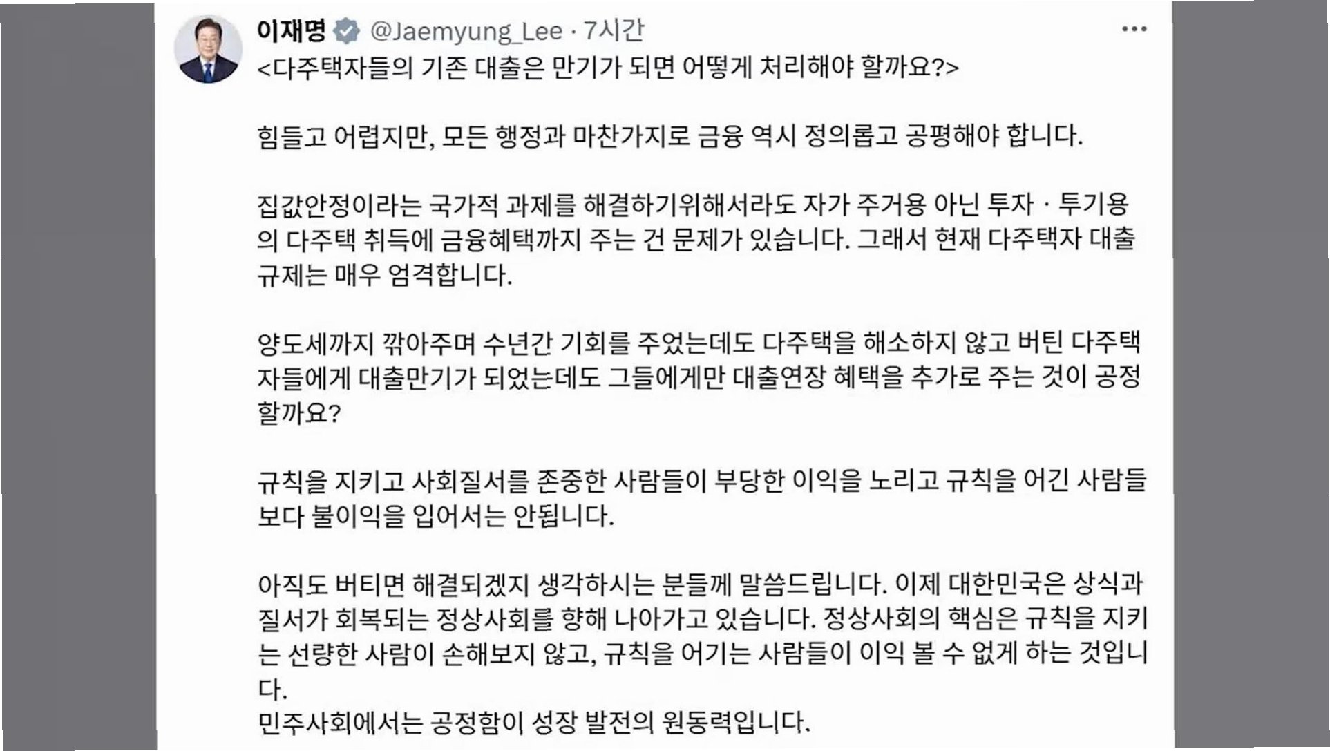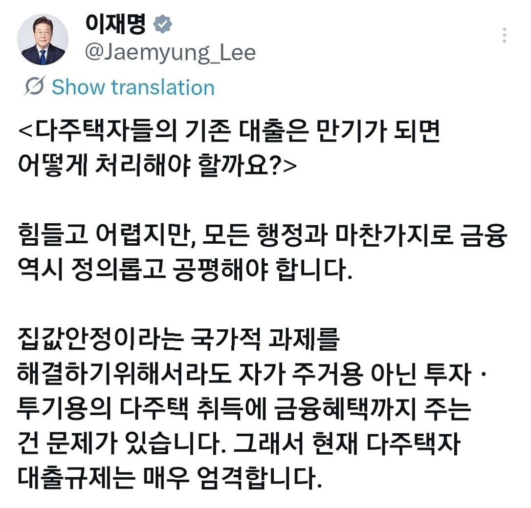 이재명 대통령은 다주택자들의 대출 만기 연장 혜택이 공정한지에 대해 의문을 제기하며, 투기용 주택 취득에 대한 금융 혜택 문제를 지적했습니다. 이는 다주택자들이 보유 주택을 매도하도록 압박하려는 의도로 해석됩니다. 대통령은 9시간 뒤 추가 글을 통해 투기용 주택 매도를 다시 한번 강조했습니다.