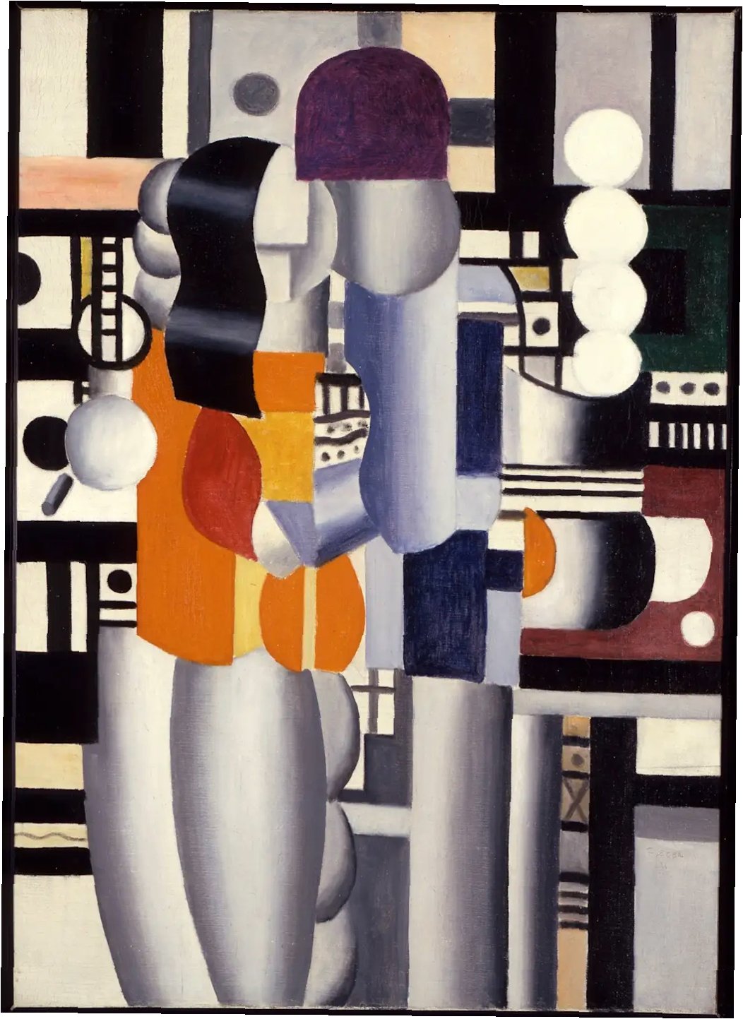 레제는 인간의 감정, 심지어 타인과의 교감이라는 섬세한 감정까지 기계적 작용으로 연결했습니다. 에서는 금속성 파이프와 철판으로 만들어진 로봇 같은 남녀가 서로 허리를 껴안고 키스에 열중합니다. 인간에게 가장 내밀한 사랑이라는 감정을 기계적인 작용으로 묘사하며, 인간과 기계의 구분이 사라진 상태를 보여줍니다. 이는 1차 세계대전 경험과 기계 문명 발달에 대한 그의 독특한 시각을 반영합니다.