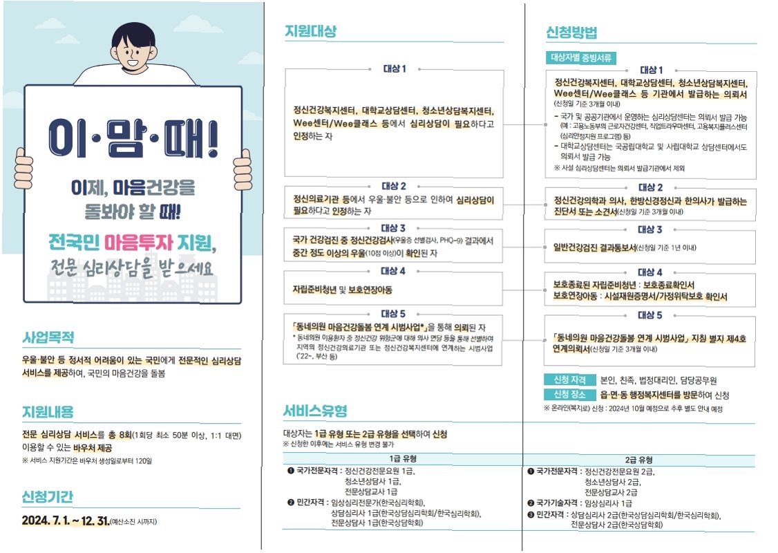 A.마음투자 지원사업은 우울·불안을 겪고 있는 국민들에게 심리상담 서비스를 제공하여 정신건강을 지원하는 것을 목적으로 하고 있습니다.