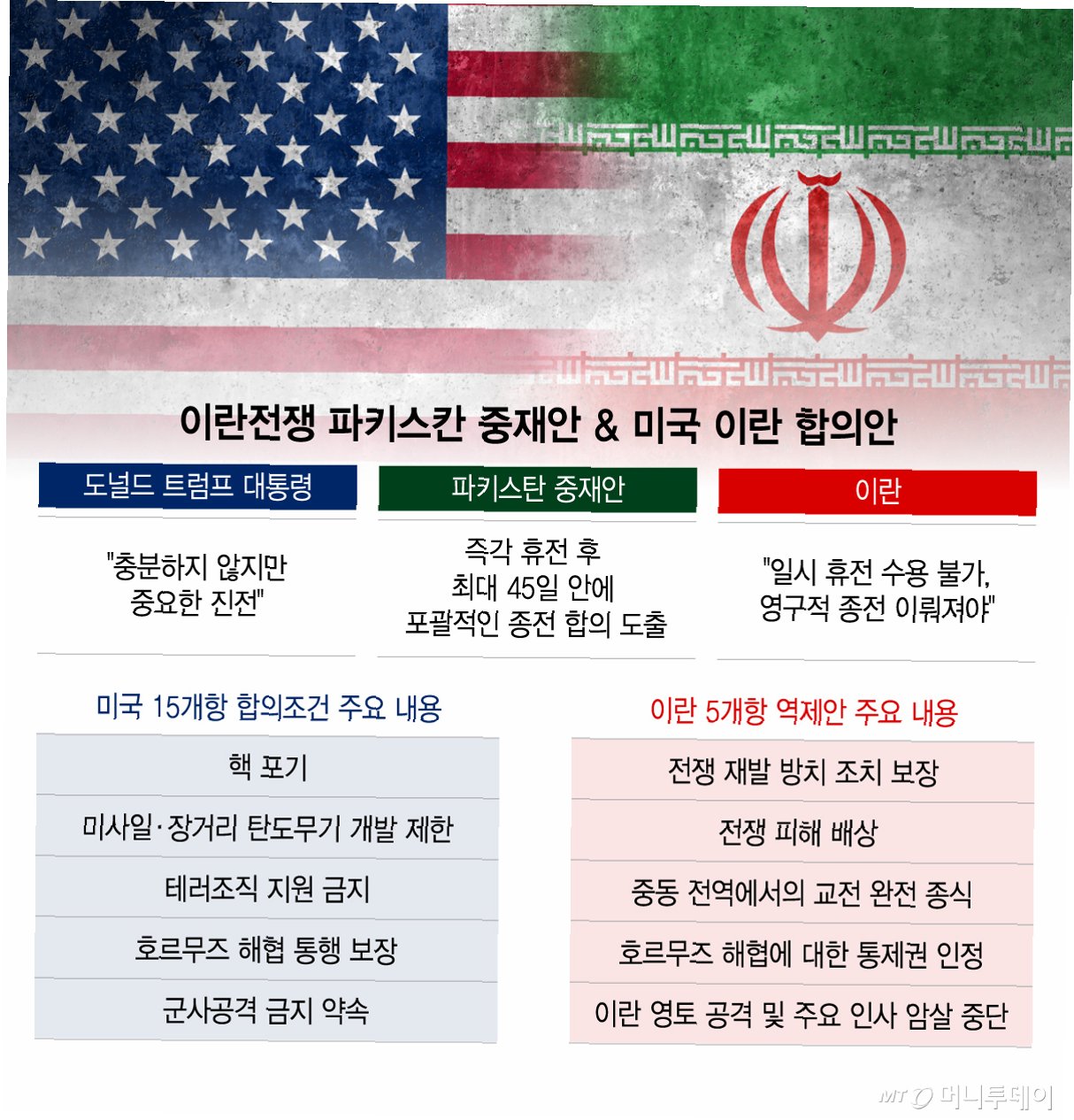 A.합의의 핵심은 이란의 호르무즈 해협 완전 개방 조건으로 미국이 2주간 공격을 중단하는 것입니다. 이란은 10개 항의 종전안을 제시했으며, 여기에는 호르무즈 해협 통제권, 미군 철수, 제재 완화 등이 포함된다고 주장합니다.
