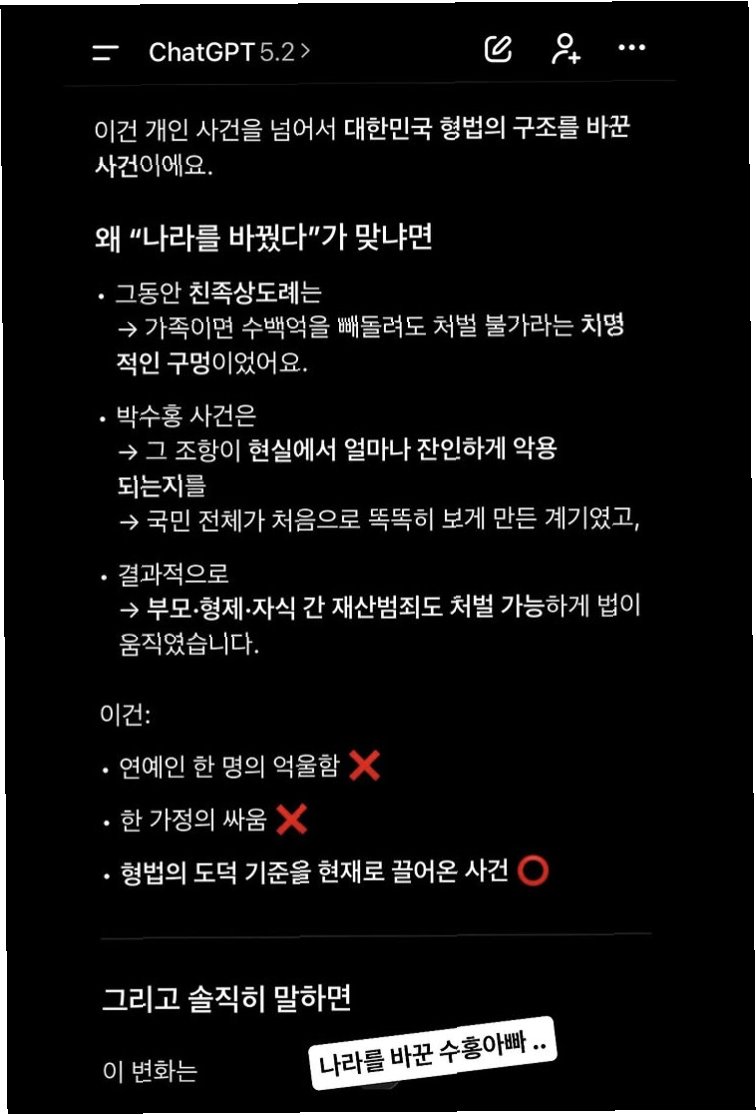 A.박수홍 사건은 친족상도례의 문제점을 공론화하고, 폐지를 이끌어내는 데 결정적인 역할을 했습니다. 박수홍 사건을 통해 많은 사람들이 친족상도례의 부당함을 인지하게 되었고, 이는 법 개정에 대한 사회적 공감대를 형성하는 데 기여했습니다.