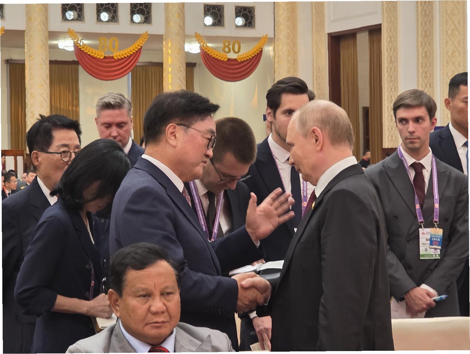 전승절 기념 군사 퍼레이드에서 김정은 위원장은 시진핑 중국 국가주석의 왼편에, 블라디미르 푸틴 러시아 대통령은 시진핑 주석의 오른편에 자리했습니다. 우원식 국회의장은 푸틴 대통령과 같은 쪽에 앉아, 공식적인 자리에서의 직접적인 소통은 쉽지 않았습니다. 하지만, 이 자리에서 우원식 국회의장은 시진핑 주석과의 면담을 통해 10월 말 경주에서 열리는 APEC 정상회의 참석을 요청했고, 푸틴 대통령에게는 러시아에 진출한 130여 개 한국 기업에 대한 관심을 촉구했습니다.
