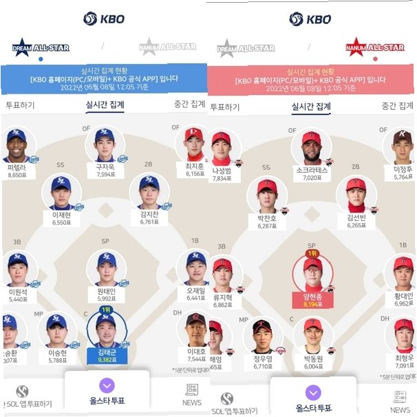 베스트 12는 6월 2일부터 6월 22일까지 KBO 홈페이지, KBO 공식 앱, 신한 SOL뱅크 앱 등 총 3개의 투표 페이지를 통해 진행된 팬 투표(70%)와 선수단 투표(30%)의 합산으로 결정되었습니다. 삼성 배찬승 선수는 선수단 투표에서 역전하며 베스트 12에 선정되는 드라마를 연출했습니다. 롯데 정철원 선수와의 치열한 경쟁 끝에, 0.42점 차이로 베스트 12에 합류하며 팬들의 뜨거운 응원에 보답했습니다.
