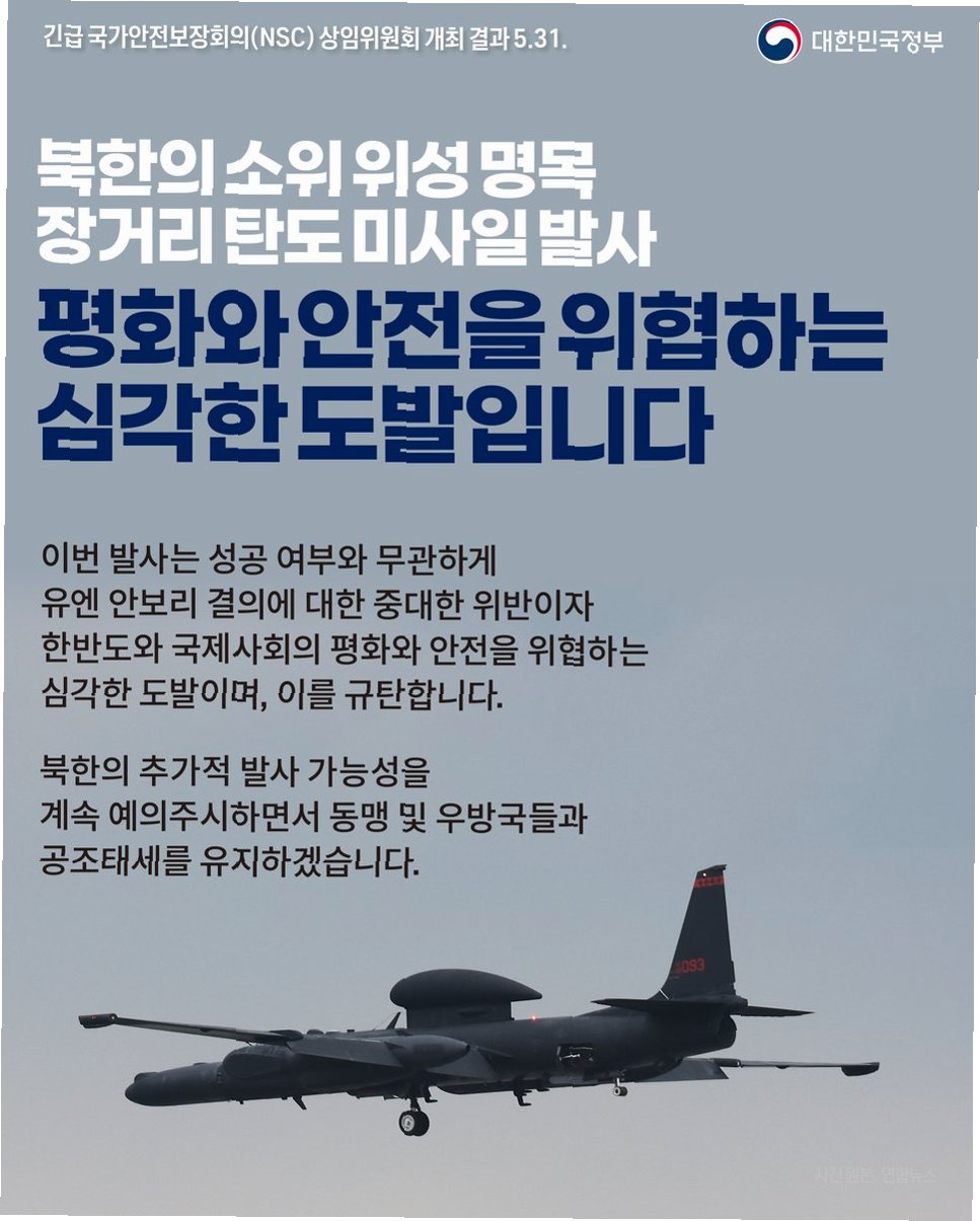 국가안보실은 이번 사태와 관련하여 국방부, 합참 등 관계기관이 참여하는 긴급 안보상황점검회의를 개최했습니다. 회의 결과는 이재명 대통령에게 즉시 보고되었습니다. 북한의 미사일은 약 350km를 비행했으며, 정확한 제원은 한미 당국이 정밀 분석 중입니다.