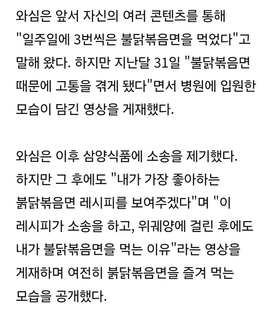 A.틱톡커는 불닭볶음면을 섭취한 후 위궤양에 걸렸다며, 제품으로 인한 피해를 주장하며 소송을 제기했습니다.