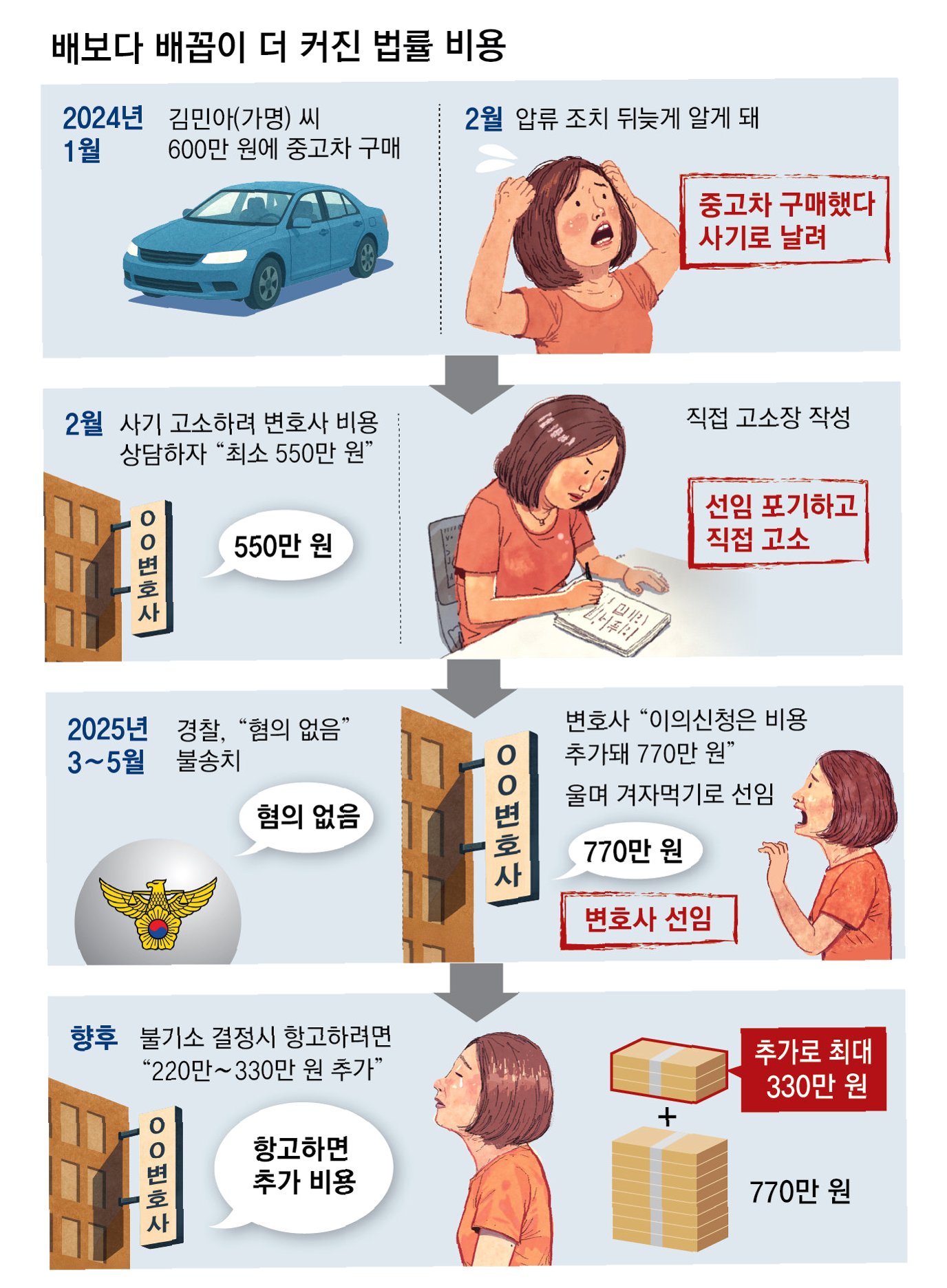 지방직 공무원 김민아 씨는 중고차 사기로 600만 원을 잃었지만, 고소를 위해 변호사를 선임하려다 550만 원의 착수금 견적을 받고 좌절했습니다. 직접 고소장을 작성했지만 증거 부족으로 불송치 결정이 났고, 이의신청을 위해 다시 변호사를 찾았지만 770만 원의 수임료를 제시받았습니다. 결국 차량 가격보다 변호사 비용이 더 커지는 상황에 김 씨는 억울함을 토로하며, “피해자에게 ‘웬만한 사기는 그냥 참으라’고 강요하는 것 아니냐”고 말했습니다.
