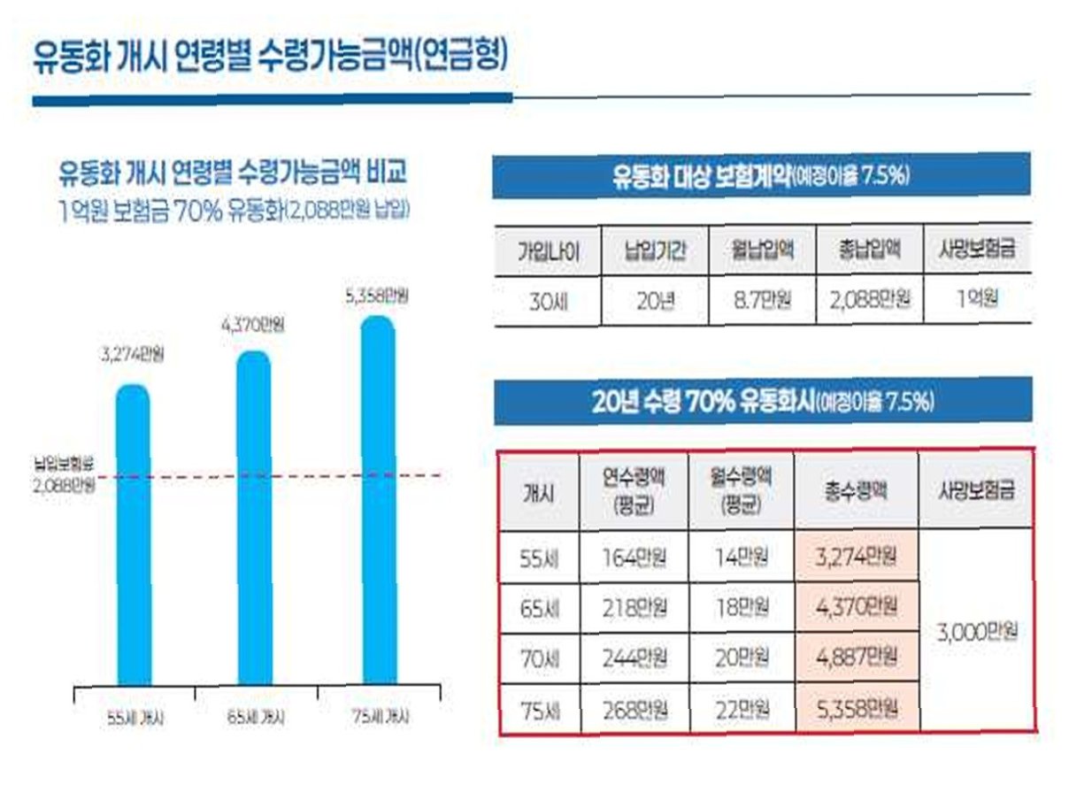A.납입 보험료, 유동화 비율, 그리고 유동화 시점의 보험 계약 예정이율에 따라 달라집니다. 일반적으로, 책임준비금을 많이 적립한 고연령일수록 더 많은 금액을 수령할 수 있습니다.