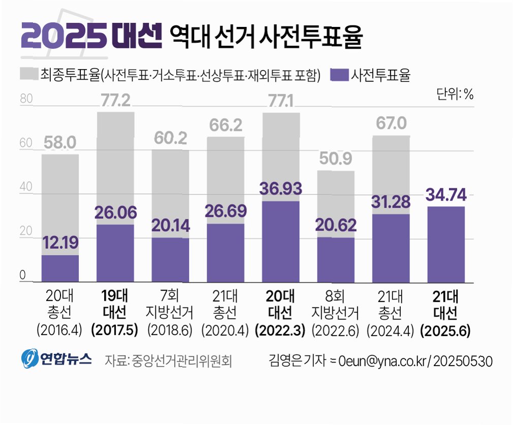 | 대선 투표율 상승, 65.5%로 역대 두 번째 높은 사전투표율 기록 (1) | 2025.06.03 |