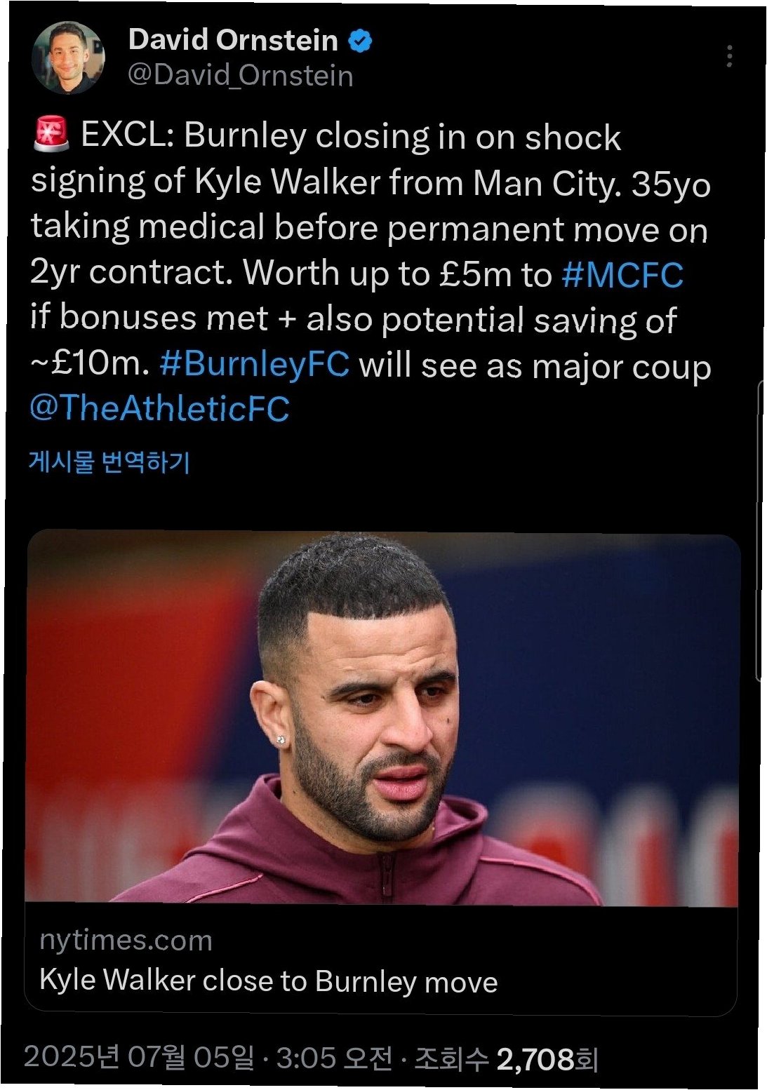 손흥민의 절친으로 알려진 카일 워커(맨체스터 시티)가 승격팀 번리로 이적하며, 팬들의 이목을 집중시키고 있습니다. 유럽 축구 이적시장 전문가 파브리지오 로마노의 보도에 따르면, 번리는 맨시티와 워커 영입에 합의했으며, 모든 절차가 완료되었습니다. 워커는 잉글랜드 프리미어리그(EPL)에 잔류하며, 2년 계약을 통해 새로운 도전을 시작합니다.