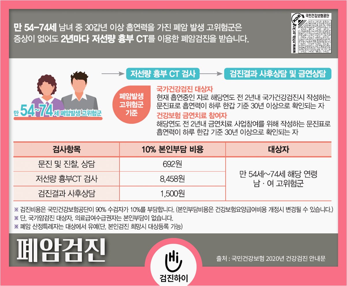 A.40세 이후에는 매년 정기검진을 받고, 고위험군에 해당한다면 저선량 CT(컴퓨터단층촬영)를 통해 꾸준히 확인하는 것이 좋습니다.