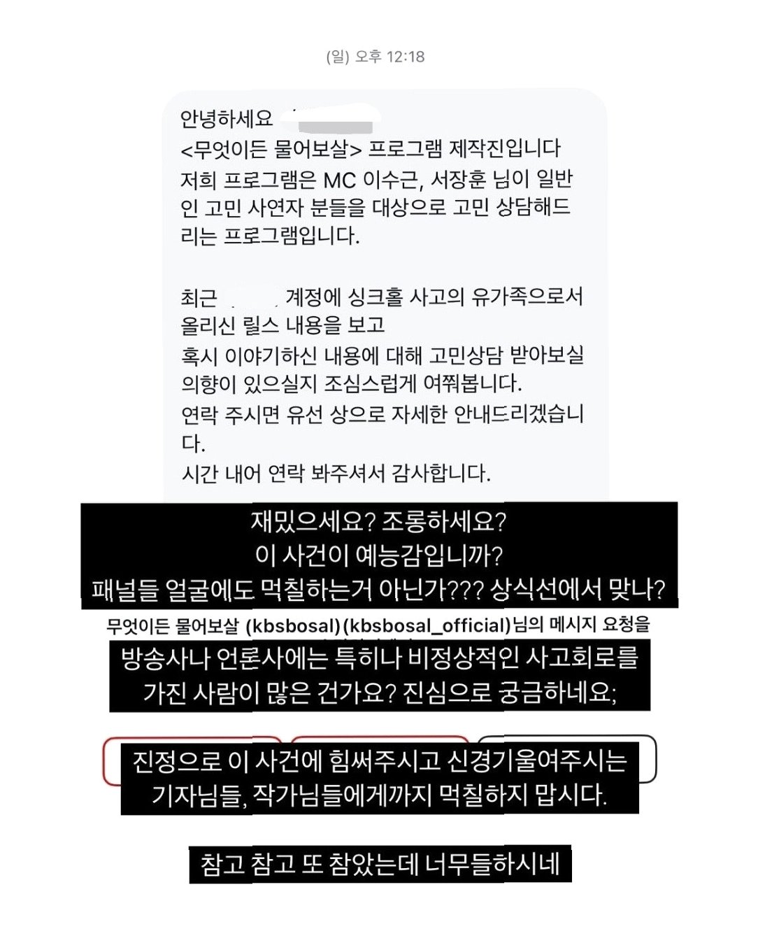 최근 서울 강동구에서 발생한 싱크홀 사고의 유족이 KBS의 예능 프로그램 '무엇이든 물어보살' 제작진의 섭외 요청에 강한 반발을 보였습니다. 유족은 소셜미디어를 통해 제작진에게 "조롱하는 것이냐"며 불만을 표출했습니다. 이들은 제작진이 보낸 메시지에 대해 "이 사건이 예능감이냐"라고 반문하며, 사고의 심각성을 이해하지 못하는 방송사와 언론사의 태도에 실망감을 드러냈습니다. 이러한 반응은 많은 이들의 공감대를 형성하며, 사고의 진정성을 다시 한 번 되새기게 만들었습니다.