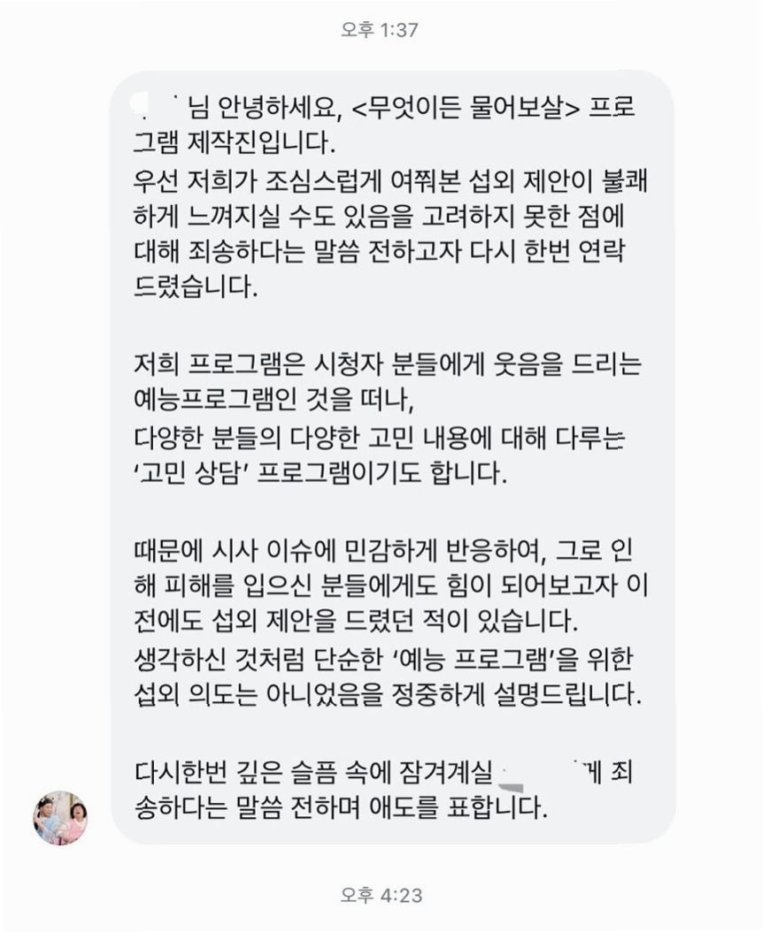 사고 유족의 반발 이후, '무엇이든 물어보살' 제작진은 사과의 메시지를 전했습니다. 제작진은 섭외 요청이 불쾌하게 느껴질 수 있음을 고려하지 못했다고 인정하며, 프로그램의 본질은 다양한 고민을 다루는 상담 프로그램이라고 강조했습니다. 하지만 유족은 이러한 해명이 자신의 아픔을 덜어주지 못한다고 반박하며, 다시 한 번 이와 같은 연락이 얼마나 상처가 되는지를 언급했습니다. 이 상황은 방송의 윤리성과 사고 피해자에 대한 배려가 얼마나 중요한지를 다시금 환기시킵니다.