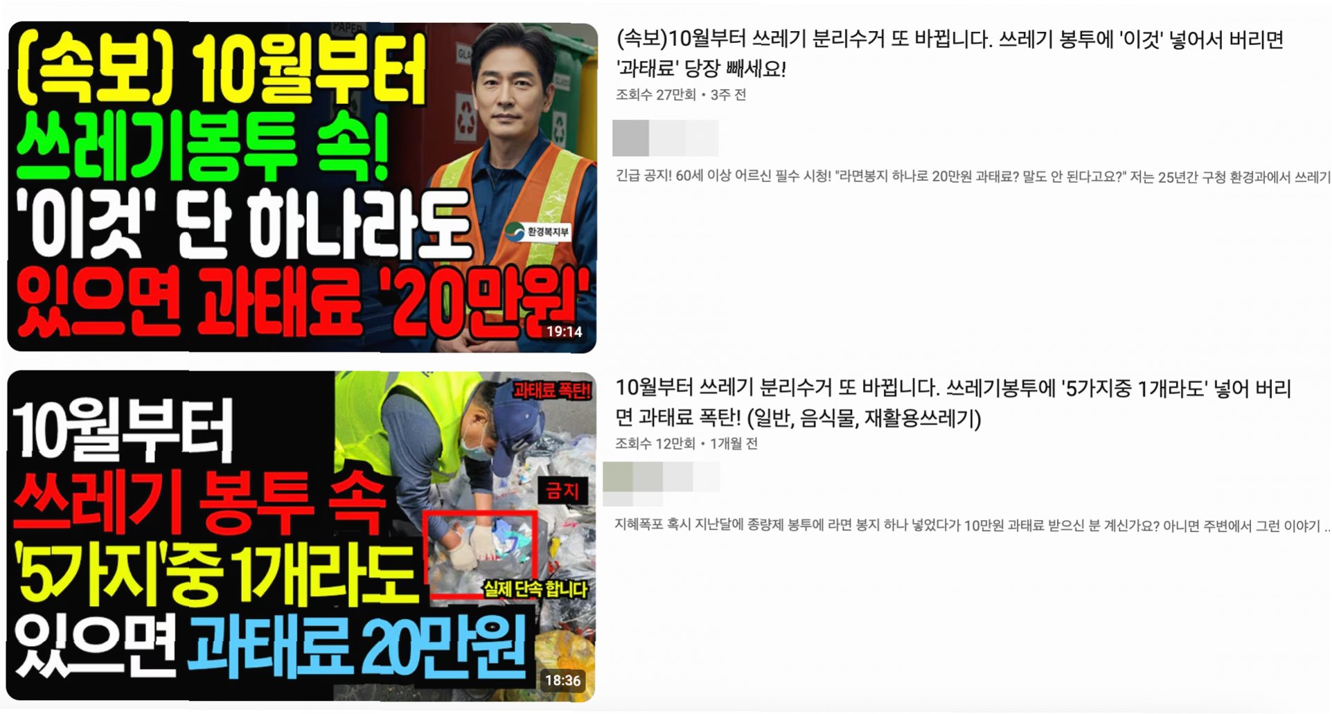 유튜브에는 마치 사실인 듯한 구체적인 사례까지 등장하여 시민들을 더욱 혼란스럽게 만들었습니다. 한 AI 영상에서는 '구청 환경과 25년 근무' 경력자를 내세워, 라면 봉투, 세척하지 않은 두부 용기, 볼펜 등을 종량제 봉투에 버려 과태료를 부과받았다는 주장을 펼쳤습니다. 이러한 내용은 시민들의 불안감을 증폭시키고, 분리수거에 대한 불신을 심화시키는 결과를 초래했습니다.