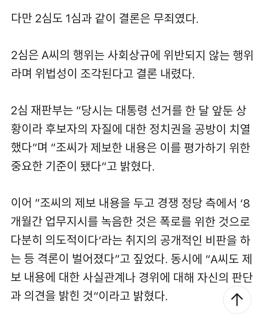 2심 재판부는 1심과 다른 판단을 내렸습니다. 2심은 A씨의 표현이 모욕적인 표현에 해당하며, 피해자 또한 특정되었다고 판단했습니다. '끄나풀', '간첩' 등의 표현이 제보자의 제보 경위에 정치적 의도가 있음을 단정하는 것이라고 보았으며, 당시 기사에 조씨의 직업과 소속, 업무가 모두 적시되어 피해자를 특정할 수 있었다고 판단했습니다. 그러나 2심은 A씨의 행위가 사회상규에 위반되지 않는 행위라고 보아 위법성 조각을 적용, 무죄를 선고했습니다. 이는 대통령 선거를 앞둔 상황에서 후보자의 자질에 대한 격론이 벌어졌고, A씨가 자신의 판단과 의견을 밝히는 과정에서 다소 모욕적인 표현을 사용한 것으로 보았기 때문입니다.