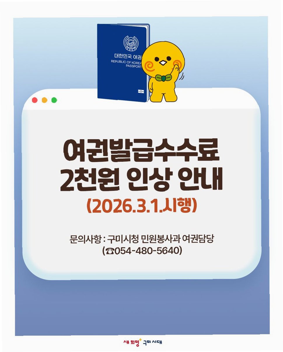 3월 1일부터 여권 발급 수수료가 2000원 인상됩니다. 20년 만의 인상으로, 차세대 전자여권 도입 후 원가 상승이 반영된 결과입니다. 해외여행 계획이 있다면 2월 말까지 신청 및 결제를 완료하여 인상 전 금액으로 발급받으세요.