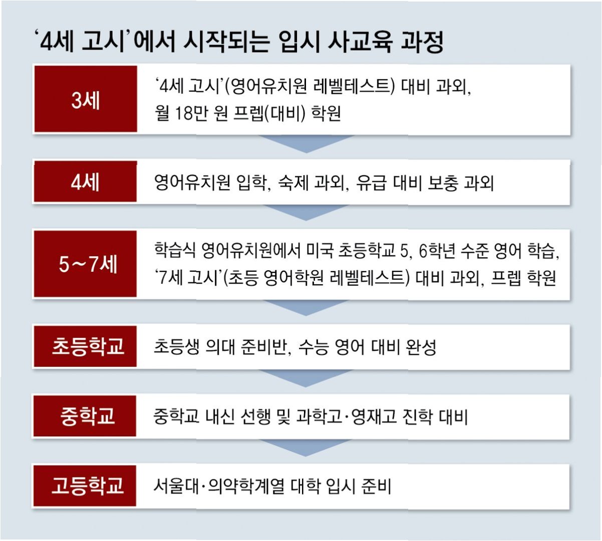 영어유치원에서 실시하는 '4세 고시'는 아이들이 영어 음가를 읽고 자기 소개를 하며 그림을 영어로 설명할 수 있는 능력을 평가하는 시험입니다. 이 시험은 사실상 아이들이 유치원 입학을 결정짓는 중요한 기준이 되고 있습니다. 최근 발표된 자료에 따르면, 영어유치원 비용은 평균적으로 한 달에 154만 5천 원에 달하고 있습니다. 이러한 높은 사교육비는 부모들에게 큰 부담이 되고 있으며, 아이들이 이 시험을 통과하지 못할 경우 유치원에 입학조차 할 수 없는 상황입니다. 교육부는 이와 같은 문제를 해결하기 위해 실태조사를 시행하고, 무분별한 선행학습과 과도한 교육비를 단속하는 방안을 마련하고 있습니다.