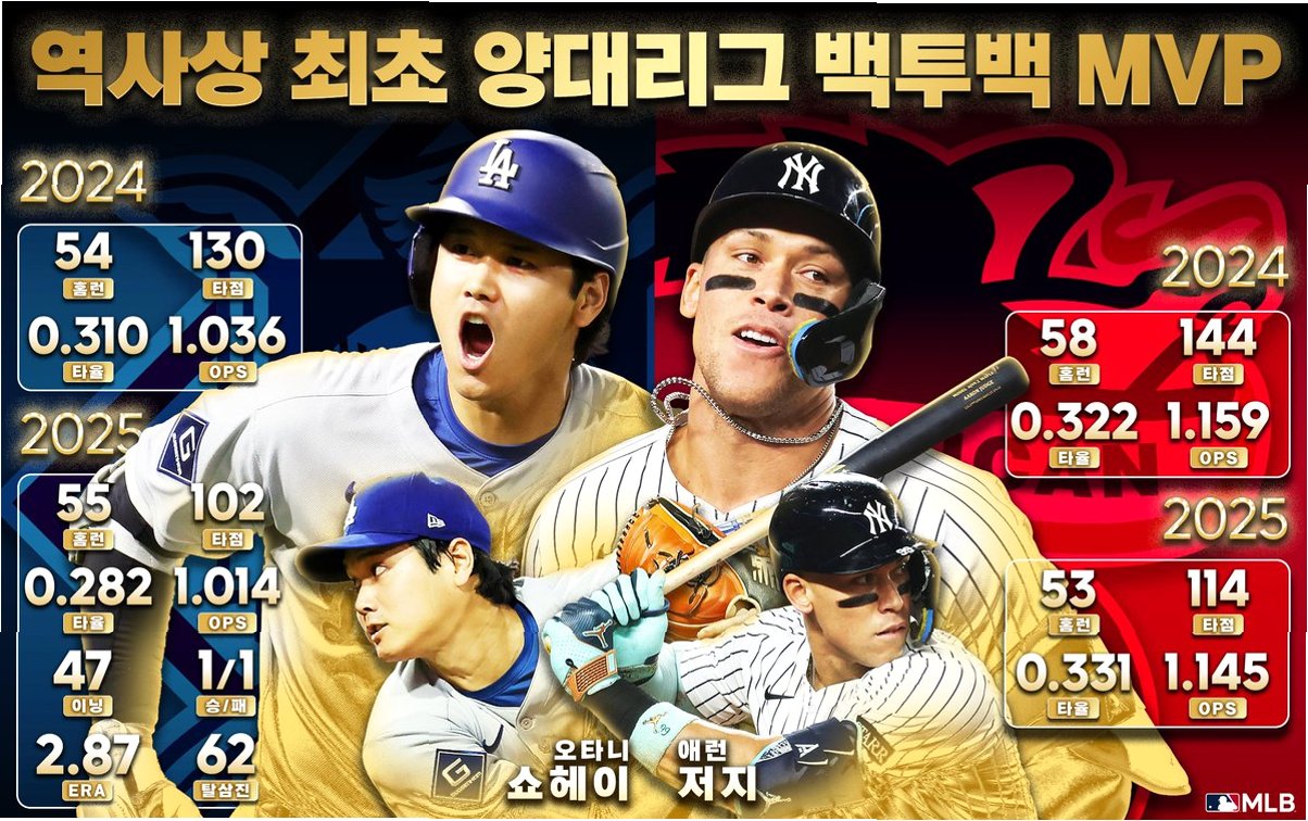 메이저리그 공식 홈페이지 MLB.com은 2년 연속 NL, AL MVP 수상자가 같은 것은 2024, 2025시즌이 처음이라며, 오타니와 저지의 시대를 선언했습니다. 두 선수의 압도적인 활약은 메이저리그 팬들에게 잊지 못할 감동과 흥분을 선사하고 있습니다. 오타니는 타자로서, 저지는 타격과 수비에서 최고의 기량을 선보이며, 메이저리그의 새로운 역사를 써내려 가고 있습니다. 앞으로 두 선수가 보여줄 활약에 전 세계 야구 팬들의 기대가 모아지고 있으며, 그들의 경쟁 또한 메이저리그를 더욱 풍성하게 만들 것입니다.