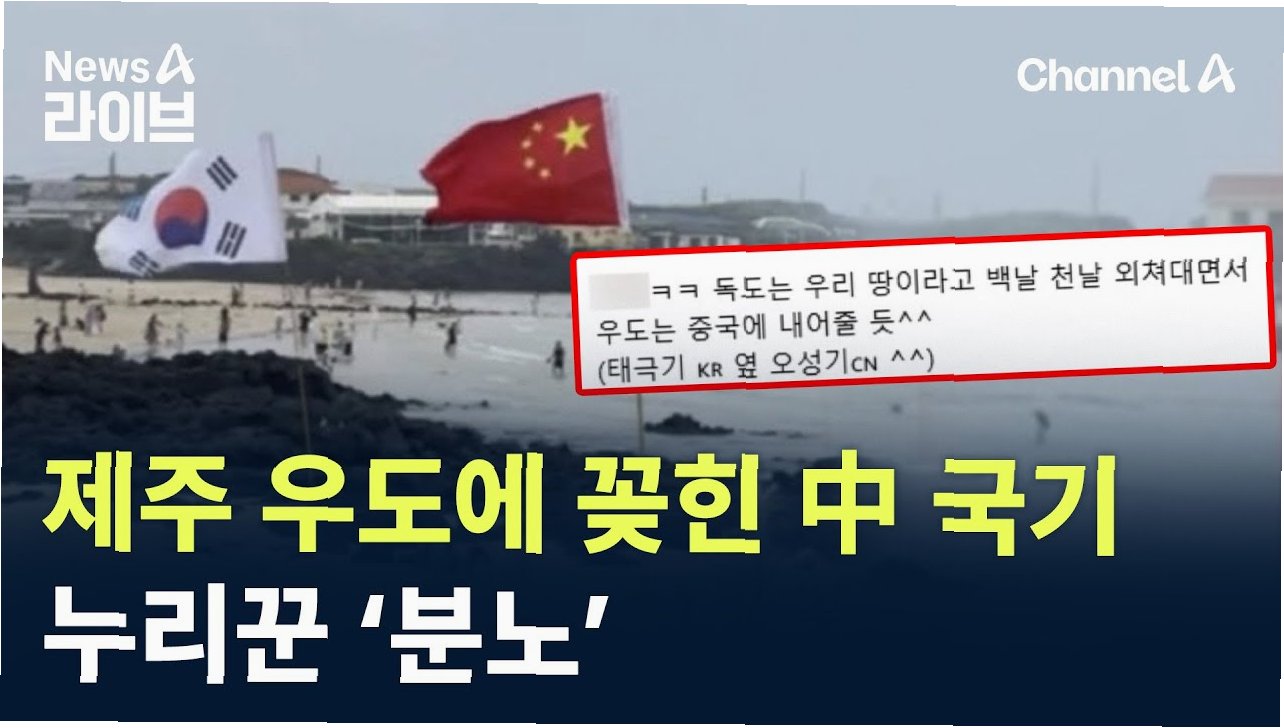 제주 섬 속의 섬 우도의 한 해변에 중국 국기인 '오성홍기' 여러 개가 꽂힌 영상이 온라인상에 퍼지면서 논란이 일고 있습니다. 해당 영상은 지난 10일 SNS에 게시된 것으로, 제주시 우도의 해변에 태극기와 오성홍기가 나란히 세워진 모습이 담겨 있었습니다. 또 중국인이 좋아하는 꽃으로 알려진 연꽃 모형 조화가 놓여 있었습니다. 지난 8일 우도를 방문했다고 밝힌 게시자는 "독도는 우리 땅이라고 백날 천날 외치면서 우도는 중국에 내어줄 듯하다"고 우려했습니다. 해당 게시물의 조회수는 나흘간 21만 회를 넘기며 삽시간에 퍼지면서 공분을 사고 있습니다.