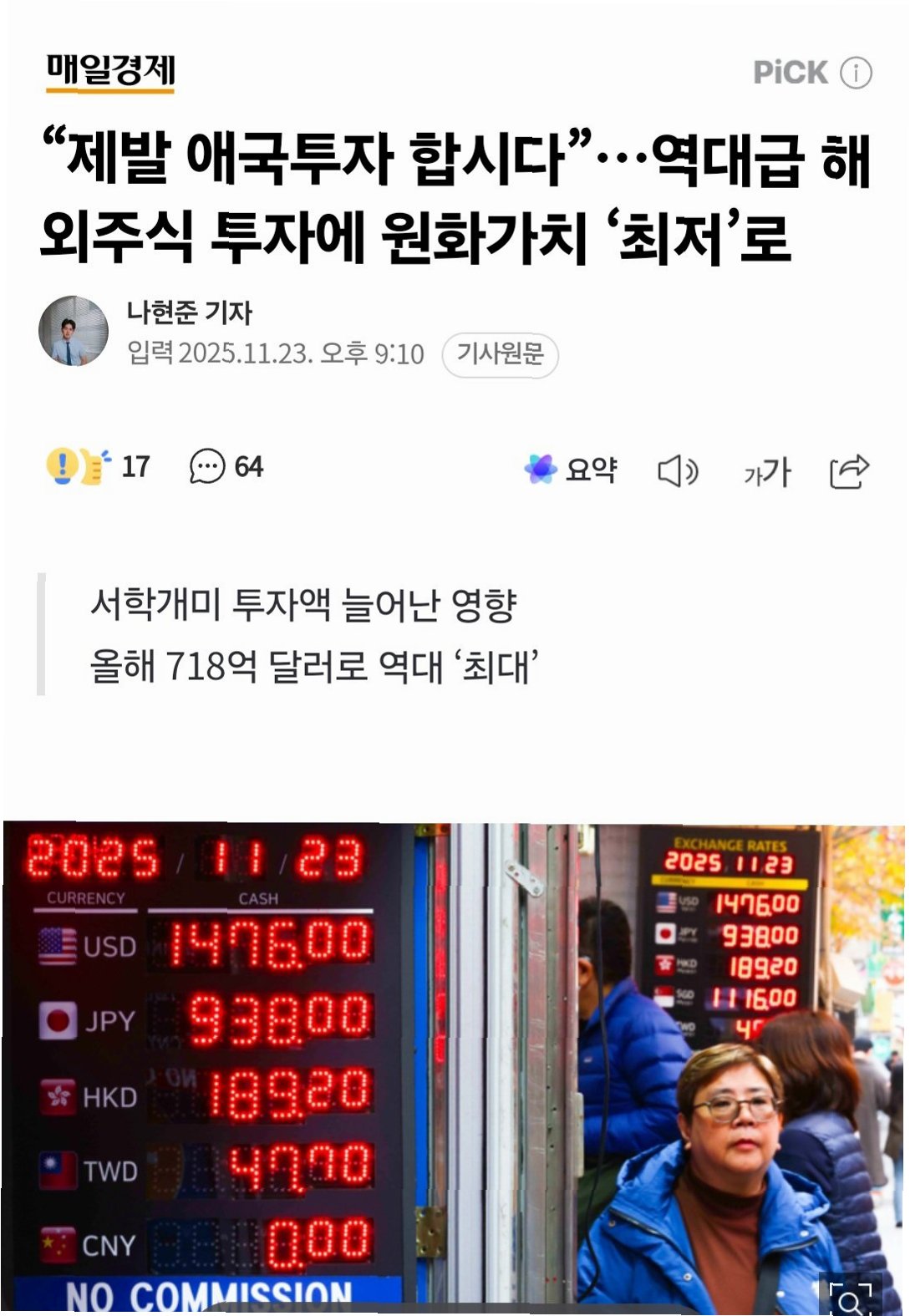 원화 가치 하락의 주요 원인 중 하나는 내국인의 해외 주식 투자액 급증입니다. 올해 1~9월 내국인의 해외 주식 투자액은 718억 달러에 달하며, 이는 지난해 421억 달러, 2023년 298억 달러에 비해 월등히 높은 수치입니다. 이러한 자금 유출은 원화 가치를 떨어뜨리는 요인으로 작용합니다.