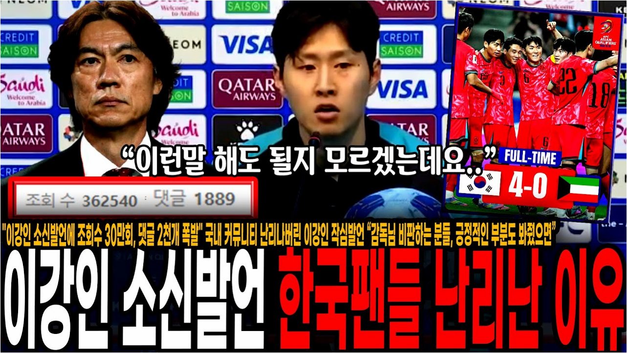 한국 축구대표팀이 쿠웨이트를 상대로 기분 좋은 대승을 거둔 후, 이강인의 발언이 팬들 사이에서 논란이 되고 있습니다. 이강인은 '어쩔 수 없이 저희도 협회 소속이고 감독님은 저희의 보스시다'라고 말하며, 감독에 대한 비판이 선수들에게도 영향을 미칠 수 있음을 강조했습니다. 그의 발언은 축구협회의 비판적인 여론 속에서 구단과 팬들 사이의 복잡한 감정을 드러내며, 선수들이 받고 있는 압박을 상징적으로 표현한 것으로 해석됩니다. 이러한 발언은 이강인이 선수로서의 소신을 갖고 있음을 보여줍니다.