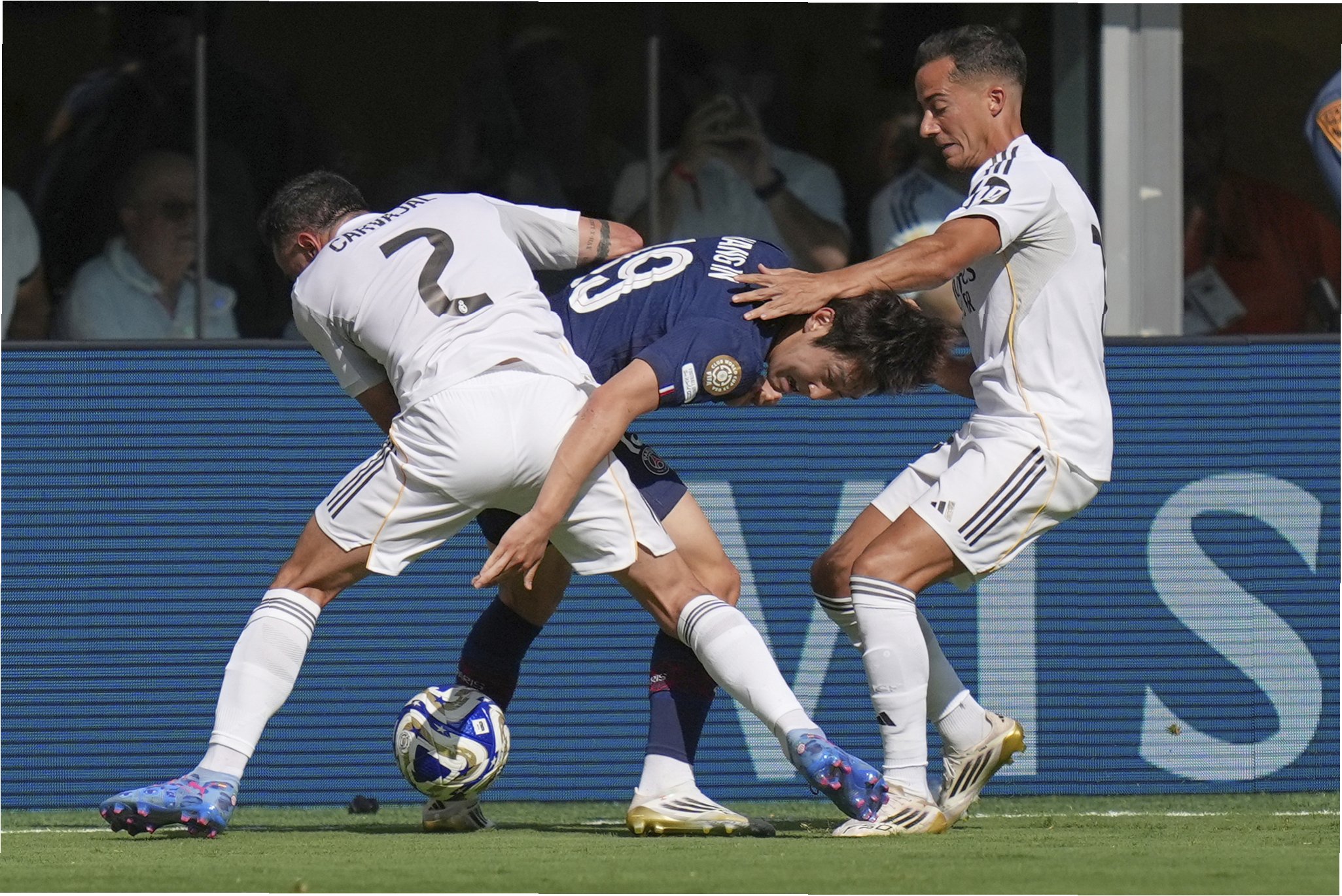 경기 초반 '키워드'는 '헬 수비'였다. 이번 클럽 월드컵에서 페널티킥 반칙을 내주고 퇴장을 당하는 등 '재앙'에 가까운 수비를 선보이던 아센시오가 6분만에 위험 지역에서 대형 실책을 범했다. PSG의 우측면 크로스를 문전에서 처리한다는 것이 그만 상대 선수에게 패스해준 꼴이 됐다. 루이스가 흘러나온 공을 왼발로 처리했다. 3분 뒤인 전반 9분엔 베테랑 수비수 뤼디거가 골키퍼에게 백패스를 하려다 헛발질을 하는 대형 실수를 저질렀다. 이를 놓치지 않고 공을 낚아챈 '발롱도르 후보' 뎀벨레는 빠르게 페널티 지역에 침투해 왼발로 추가골을 갈랐다. 레알은 와르르 무너졌다. 전반 24분 하키미가 빠른 발로 상대 수비 뒷공간을 파고 들었다.