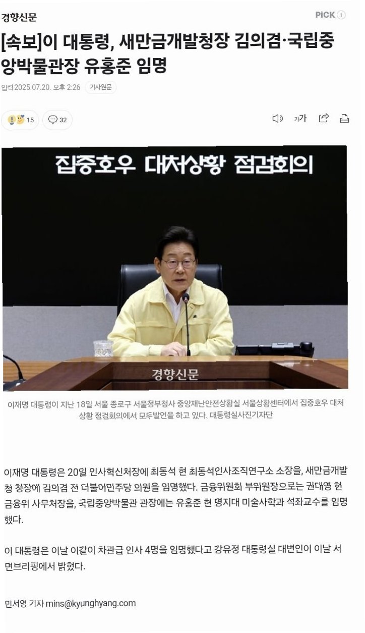 20일, 강유정 대통령실 대변인의 서면 브리핑을 통해 이재명 대통령이 유홍준 전 문화재청장을 국립중앙박물관장으로 임명했다는 소식이 전해졌습니다. 이번 인사는 문화 예술계에 새로운 활력을 불어넣고, 국민들에게 더욱 풍성한 문화적 경험을 제공하겠다는 의지를 담고 있습니다. 유홍준 신임 관장은 문화재청장 역임 당시 보여준 뛰어난 리더십과 전문성을 바탕으로 국립중앙박물관의 발전을 이끌어갈 것으로 기대됩니다. 그의 임명은 단순히 한 기관장의 교체를 넘어, 대한민국 문화 정책의 새로운 방향성을 제시하는 중요한 신호탄이 될 것입니다.