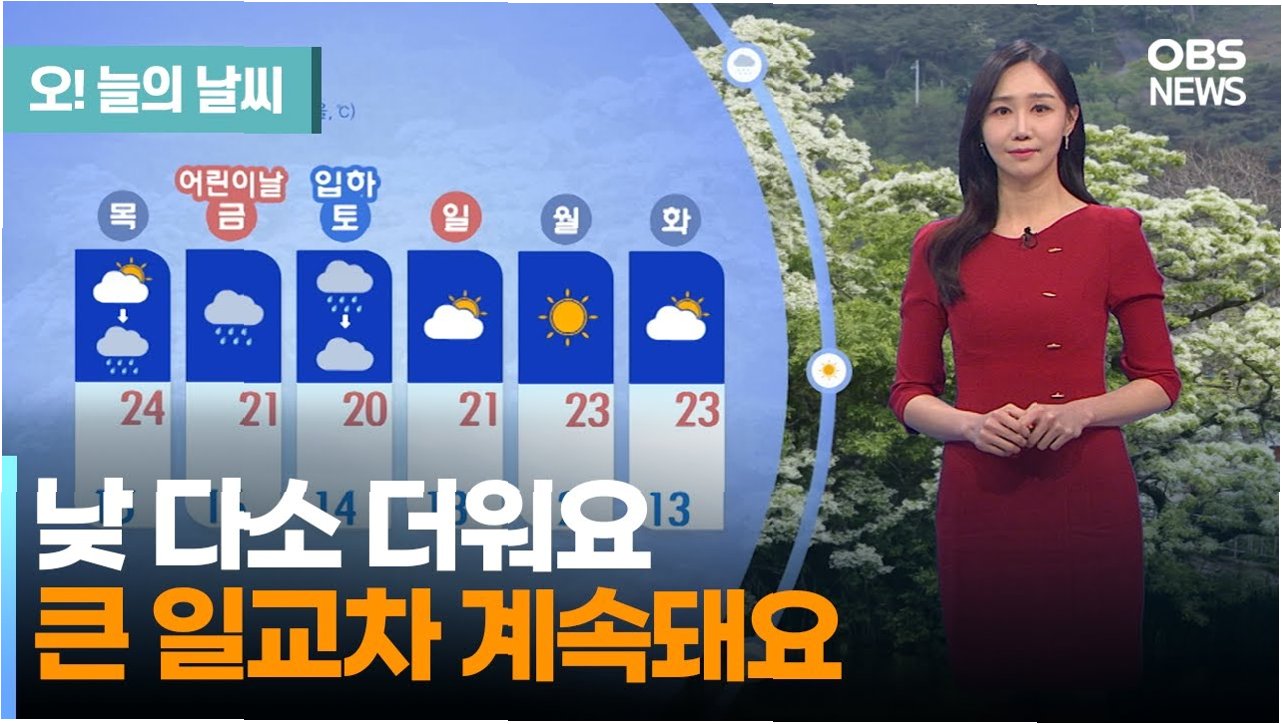 5월의 화창한 주말을 기대하셨다면, 오늘 아쉬움이 크셨을 겁니다. 강한 비바람에 나들이도 쉽지 않았습니다. 하지만 기상청에 따르면 계절의 여왕다운 날씨는 곧 찾아올 예정입니다. 강원도 평창 대관령에서는 하루 종일 비가 계속되었으며, 중부 지방과 호남 지역을 중심으로 전국 곳곳에서 비와 바람이 이어졌습니다. 낮 기온도 전국적으로 13도에서 20도 사이로 평년보다 낮아 다소 쌀쌀한 날씨를 보였습니다. 하지만 기온은 일요일인 내일부터 점차 평년 수준으로 회복될 것으로 예상됩니다. 기상청은 기온이 오르더라도 낮과 밤의 기온차가 클 것으로 보아 건강 관리에 유의할 필요가 있다고 전했습니다.