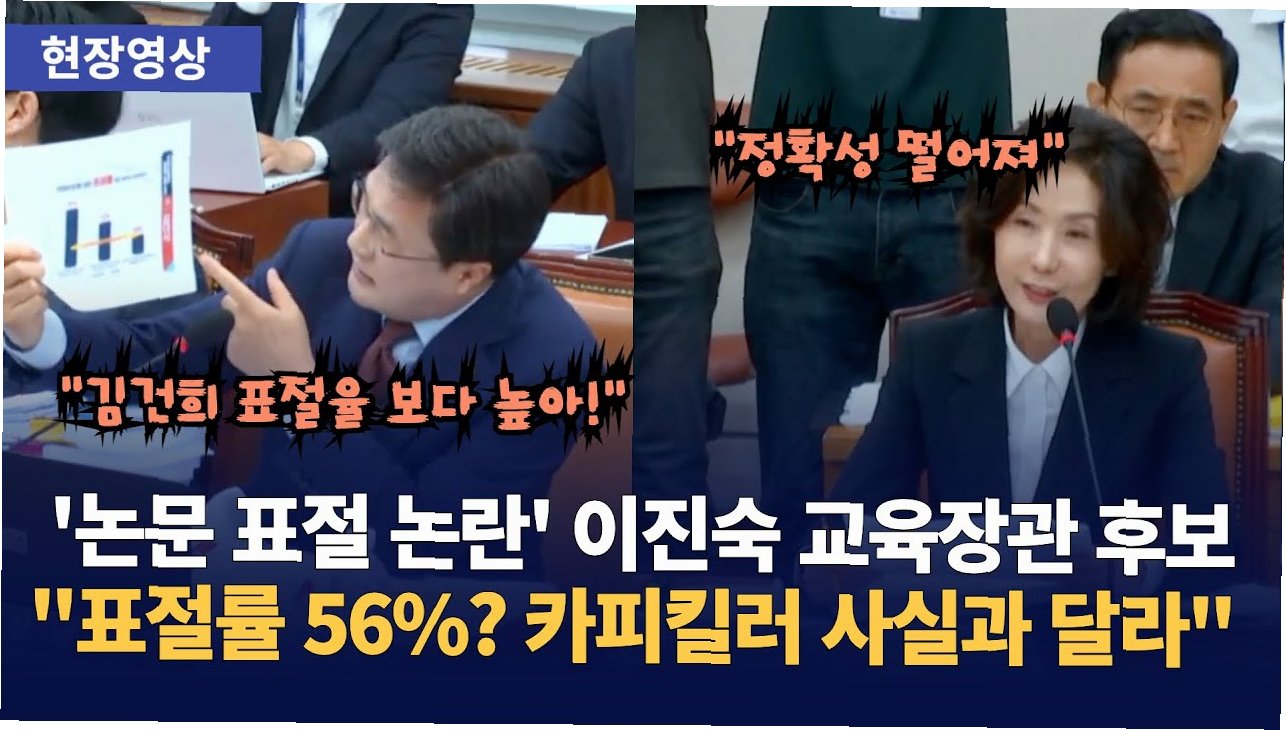 이진숙 교육부 장관 후보자가 국회 인사청문회에서 자신의 학위논문 표절 의혹에 대해 정면 반박했습니다. 김대식 국민의힘 의원은 국민검증단의 '카피킬러' 검증 결과를 인용하며, 이 후보자의 논문 표절률이 김건희 석사학위 논문보다 높은 56%에 달한다고 주장했습니다. 이 주장은 학계와 사회에 큰 파장을 일으키며, 후보자의 도덕성과 자질에 대한 의문을 제기했습니다.