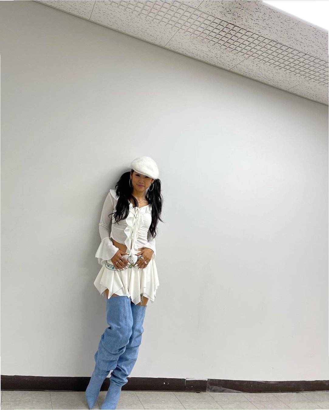 세련된 스타일링: 화이트 톤 의상과 롱부츠의 조화