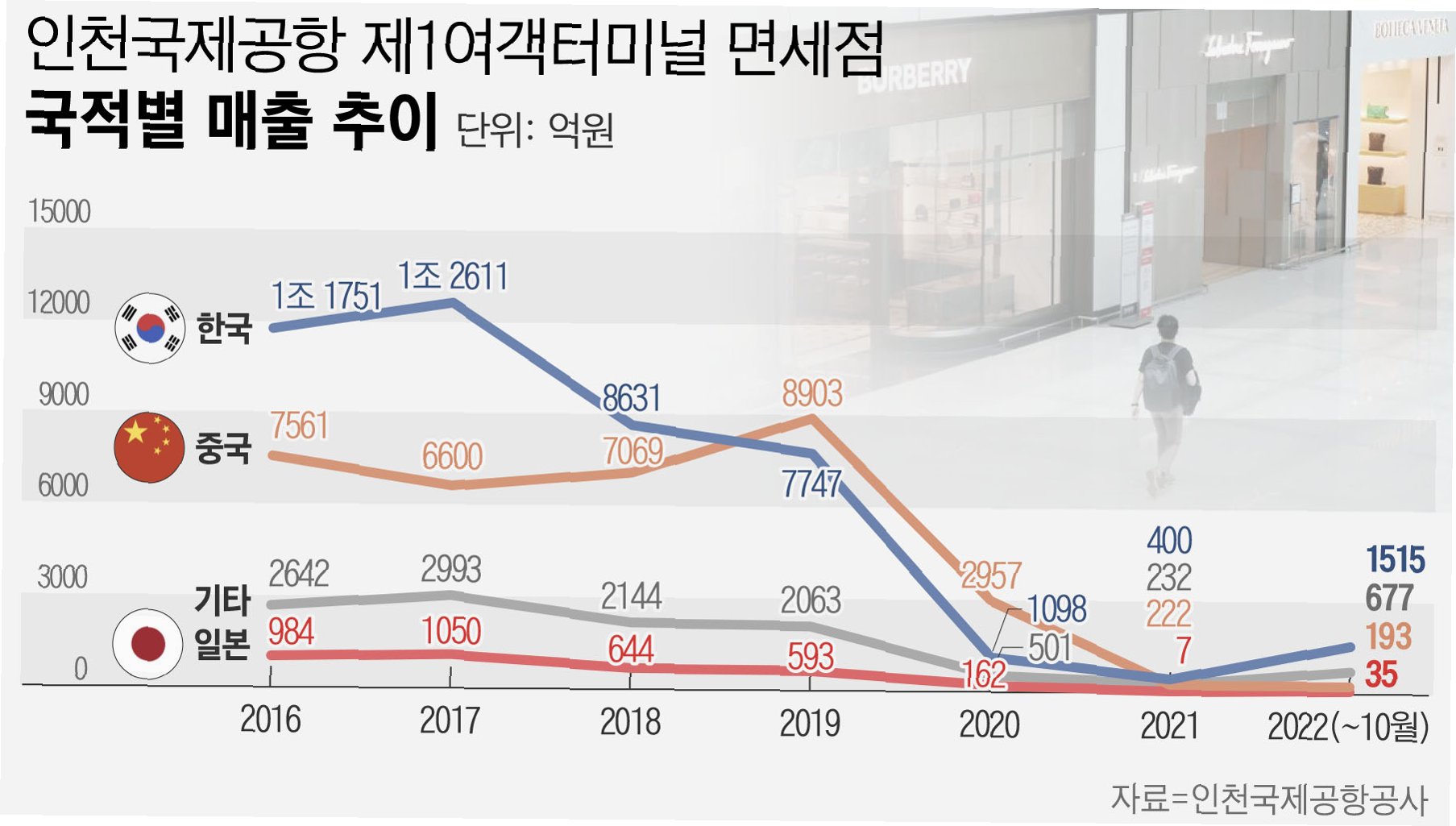 인천공항 면세점 관계자는 “'여기부터 저기까지 주세요'라며 대량 구매를 하던 중국인 관광객은 크게 줄고, 과자나 담배 등 단가가 낮은 상품만 조금 사가는 수준”이라고 말했다. 한국면세점협회에 따르면, 외국인의 1인당 구매액은 27.1%나 감소했다. 외국인 관광객들은 면세점 쇼핑 대신 올리브영이나 다이소 등 국내 생활 유통 채널을 선호하는 추세다.