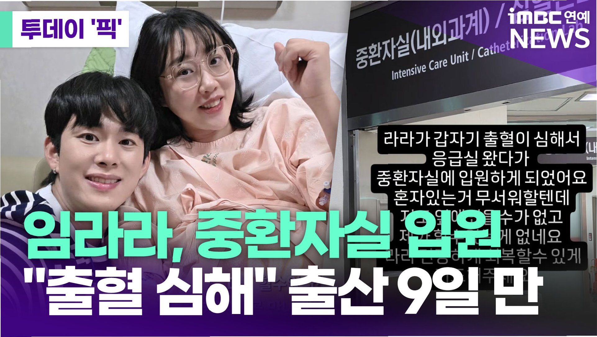 개그우먼 출신 유튜버 임라라가 쌍둥이 출산 후 건강 악화로 중환자실에 입원했다는 안타까운 소식이 전해졌습니다. 많은 팬들의 축복 속에 쌍둥이를 얻었지만, 예상치 못한 어려움에 직면한 임라라의 소식은 많은 이들에게 안타까움을 주고 있습니다. 남편 손민수는 자신의 소셜미디어를 통해 임라라의 상태를 알리며, 팬들의 간절한 기도를 부탁했습니다. 출산 후 갑작스러운 출혈로 응급실을 찾았고, 결국 중환자실에 입원하게 된 임라라의 소식은 많은 이들에게 걱정을 안겨주고 있습니다.