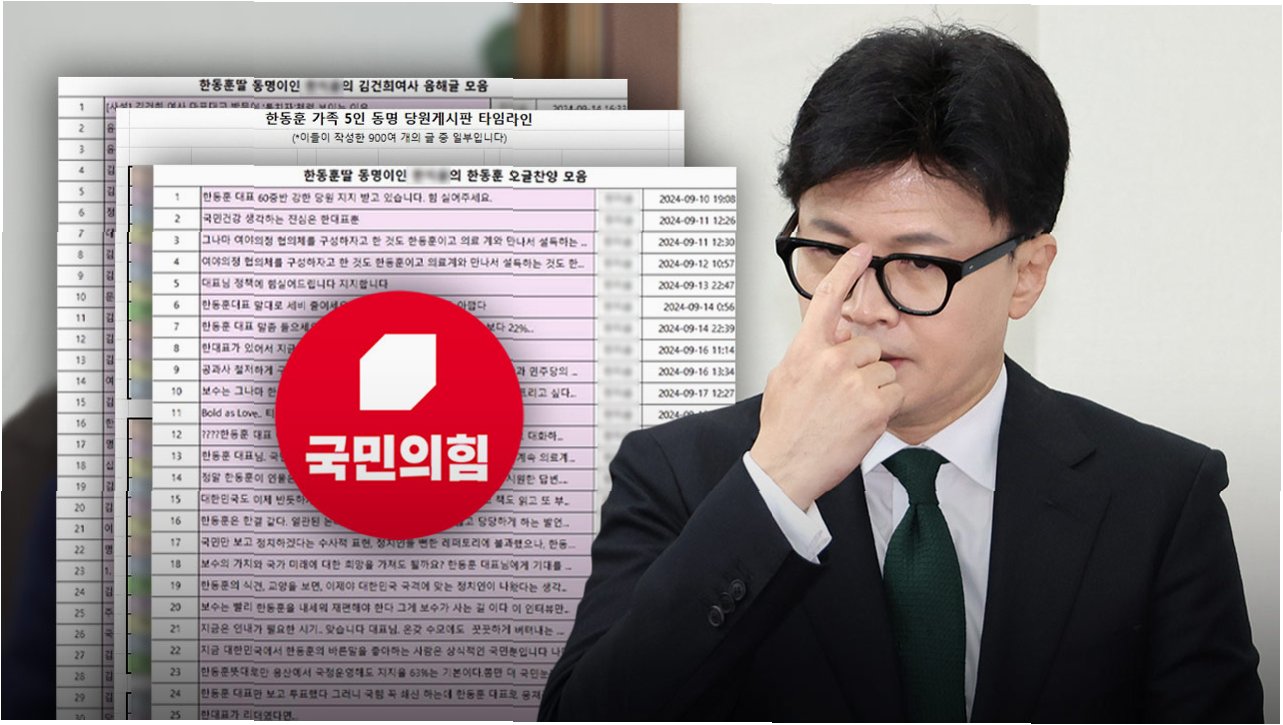 A.국민의힘 당원 게시판에서 한동훈 전 대표와 그의 가족 관련 검색 시, 윤석열 전 대통령 부부를 비난하는 글들이 다수 발견된 의혹입니다.