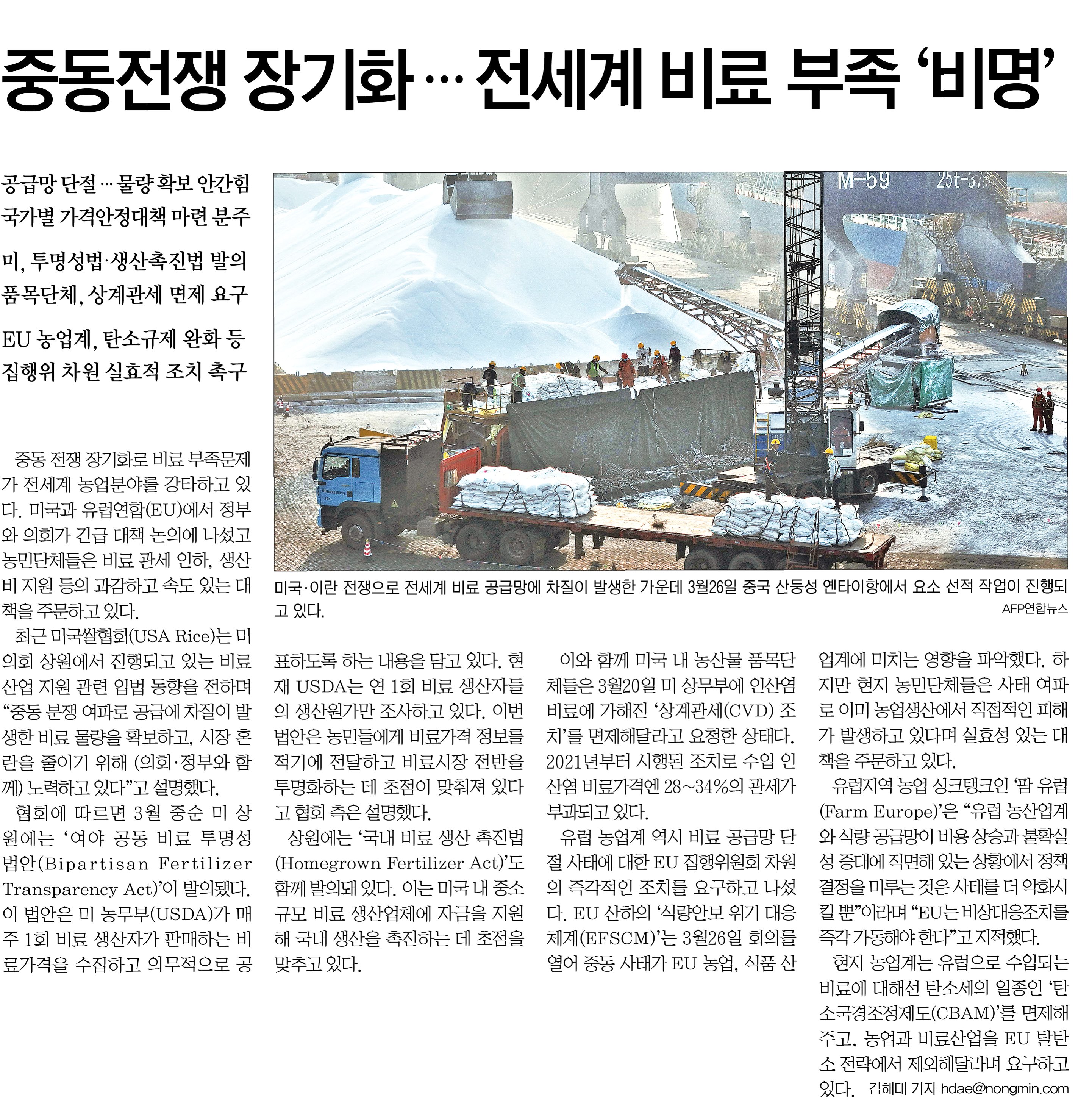 중동 전쟁 장기화로 인해 전 세계 비료 공급망에 심각한 차질이 발생하며 농업 분야가 큰 위기에 직면했습니다. 각국 정부와 의회는 긴급 대책 마련에 분주하며, 농민 단체들은 관세 인하 및 생산비 지원 등 과감하고 신속한 조치를 촉구하고 있습니다. 이는 단순히 물량 확보를 넘어 시장 혼란을 줄이고 농업 생산성을 유지하기 위한 절박한 노력입니다.