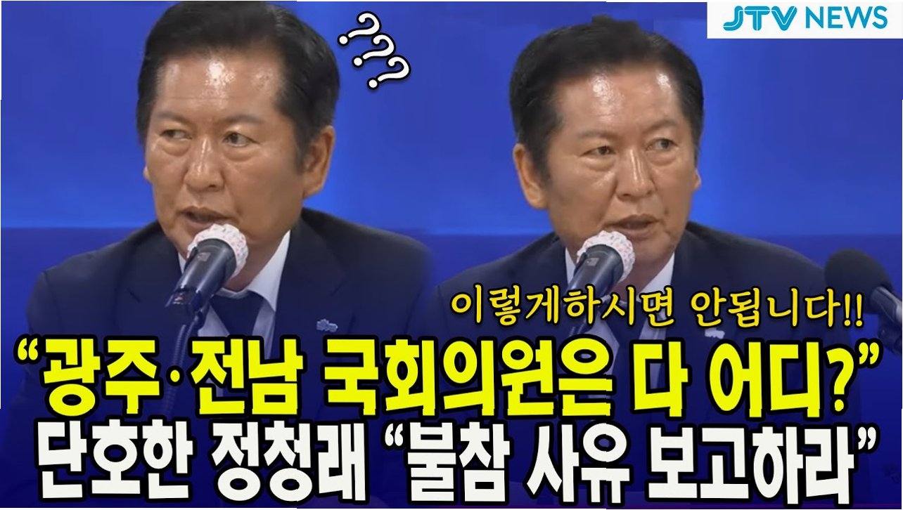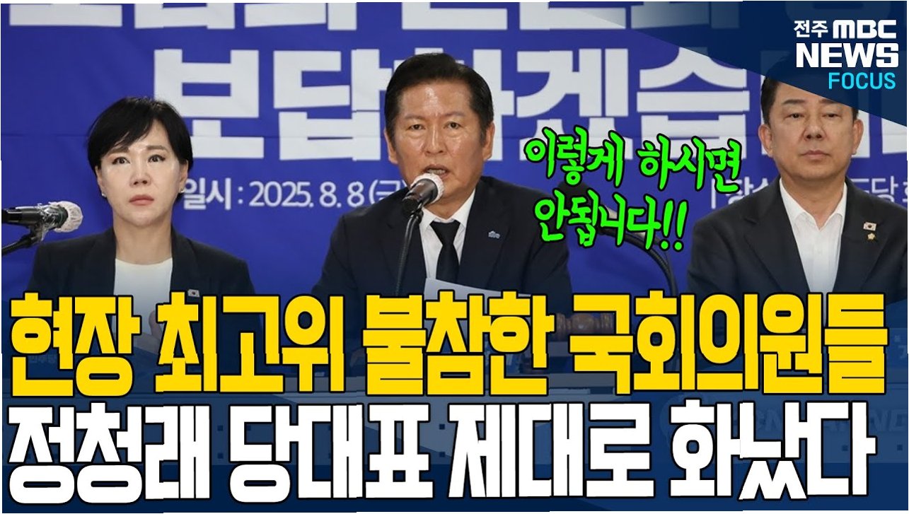 정청래 더불어민주당 대표가 현장 최고위원회의에 낮은 참석률을 지적하며 불참 의원들에게 해명을 요구했습니다. 8일 광주·전남 합동 현장 최고위원회의에서 정 대표는 “오늘은 전당대회 이후 첫 현장 최고위로 광주·전남 합동회의”라며 “광주시당위원장(양부남 의원)과 전남도당위원장(주철현 의원)은 오셨는데 광주전남 소속 국회의원들은 다 어디 갔느냐”고 질책했습니다.