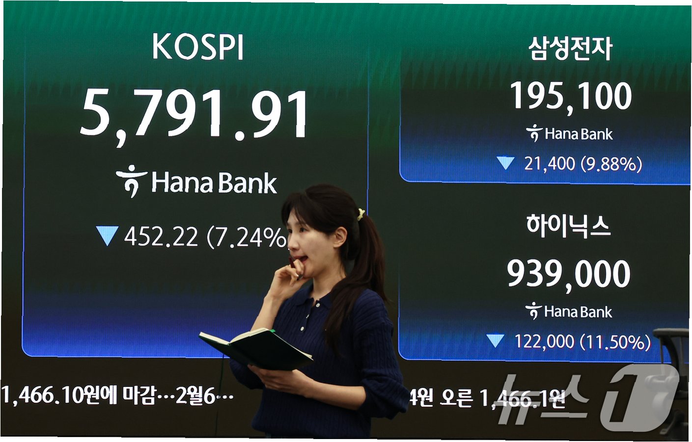 이날 코스피 하락의 주된 요인은 외국인의 대규모 순매도였습니다외국인은 무려 5조 2500억 원어치를 순매도하며 시장에 큰 부담을 안겼습니다. 기관 역시 8400억 원을 순매도했습니다. 이러한 매도세에 힘입어 코스피를 이끄는 삼성전자와 SK하이닉스 역시 큰 폭으로 하락했습니다. 삼성전자는 9.88% 급락한 19만 5100원에, SK하이닉스는 11.50% 하락한 93만 9000원에 거래를 마쳤습니다. 이는 각각 20만 전자, 100만 전자 타이틀을 반납하는 결과였습니다.