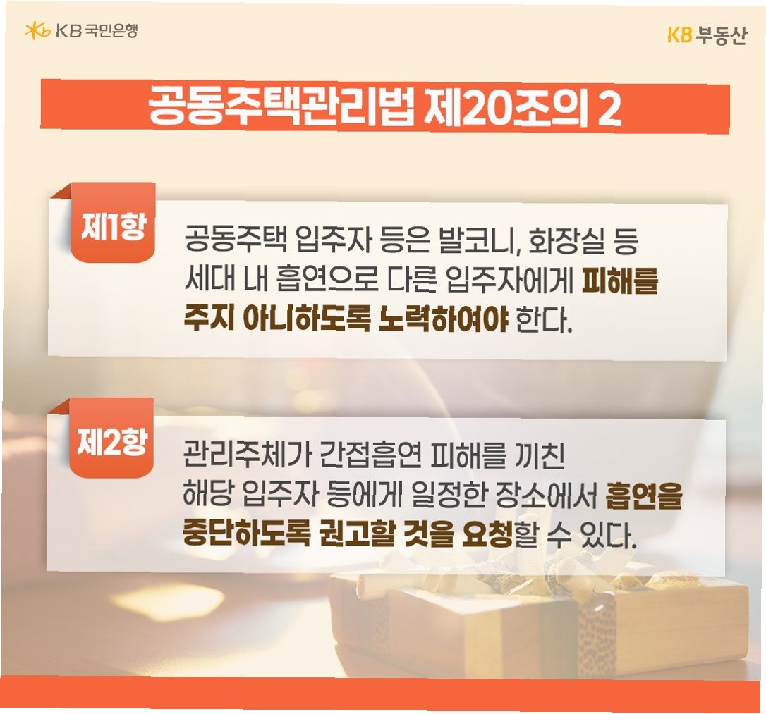 A.현행 공동주택관리법의 실효성을 높이기 위해 과태료 부과 등 실질적인 처벌 조항을 마련해야 합니다. 또한, 흡연 관련 규정을 강화하고, 주민 간의 소통과 합의를 통해 쾌적한 주거 환경을 조성하기 위한 노력이 필요합니다.