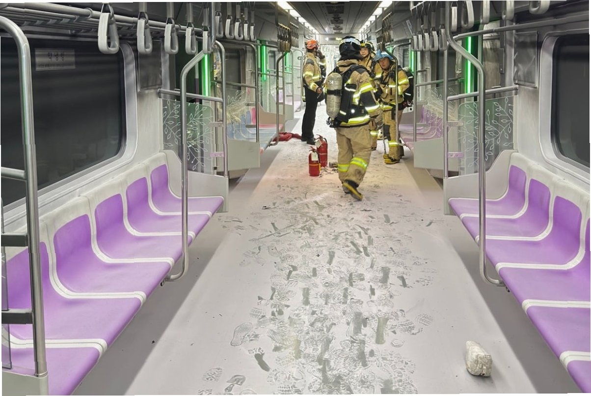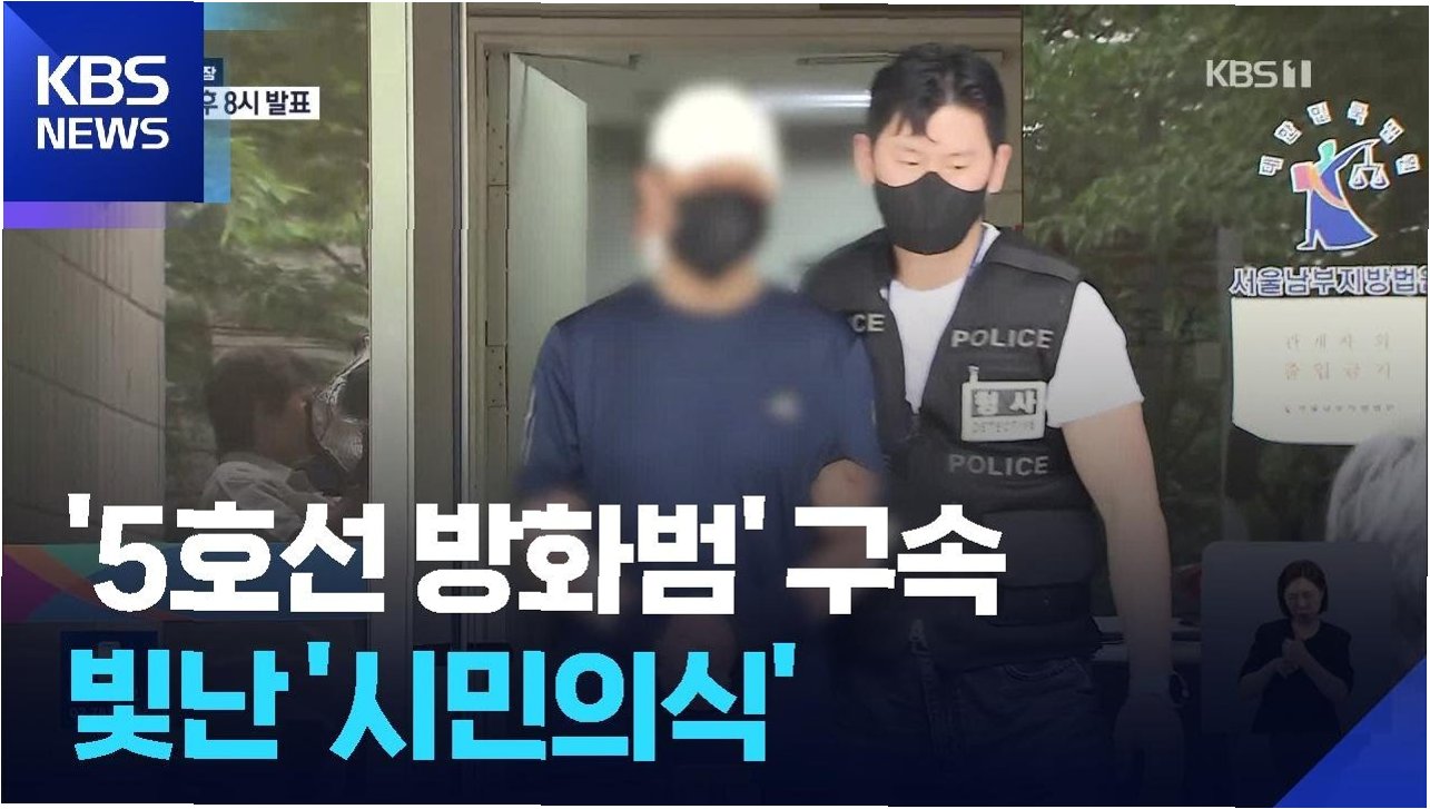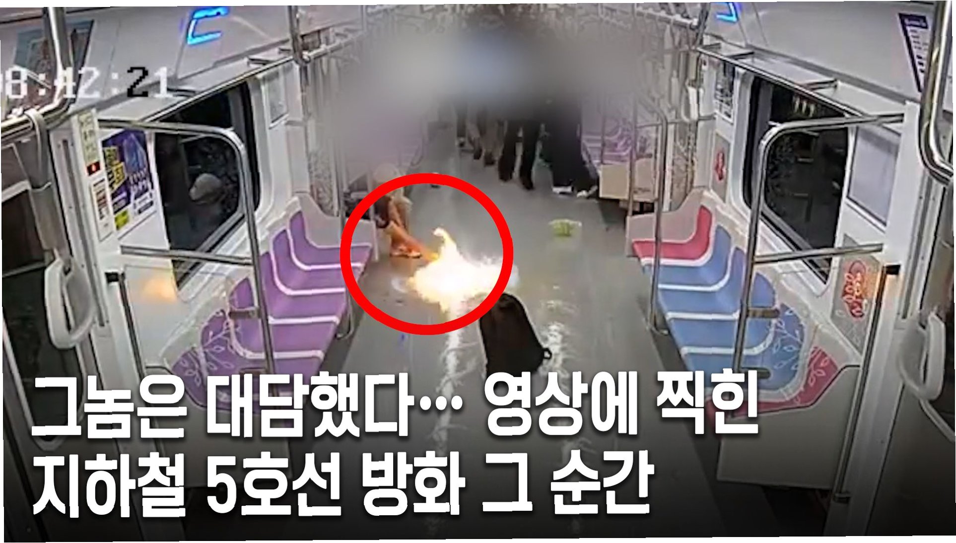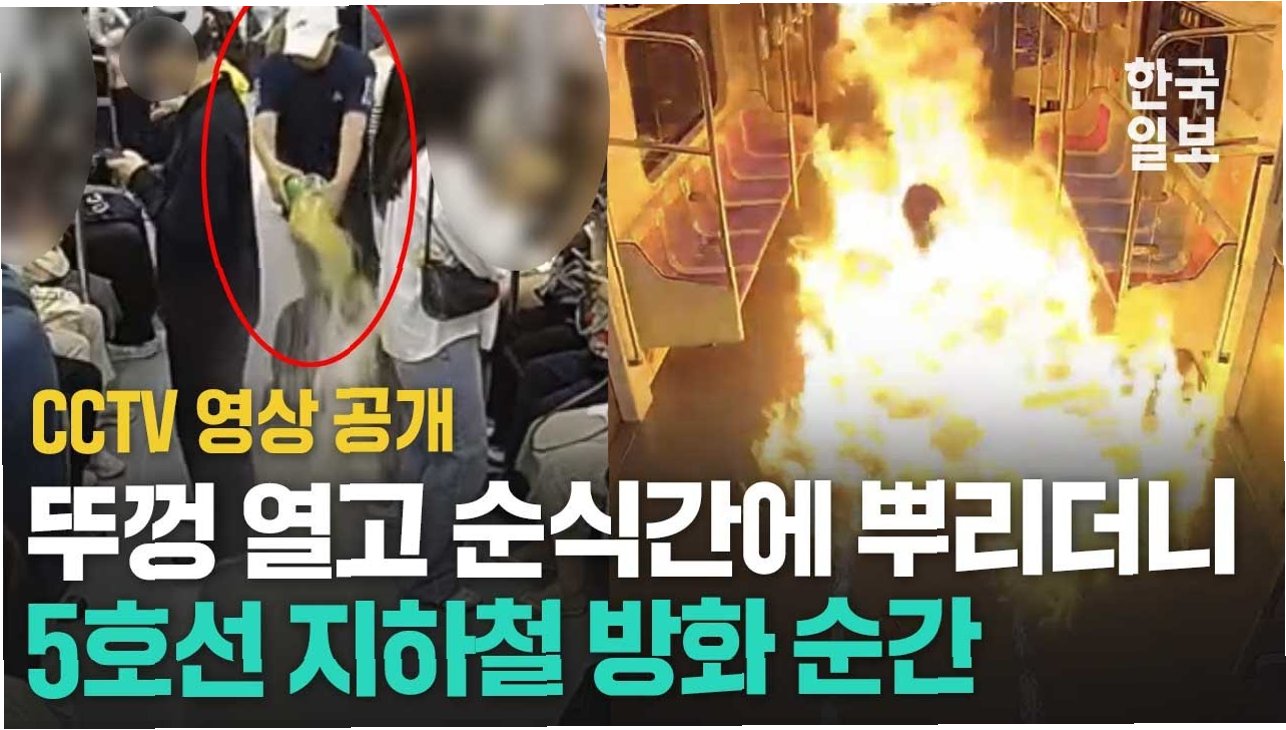 지난달 발생한 서울 5호선 방화 사건 당시 열차내부 CCTV가 공개됐다. 25일 연합뉴스에 따르면 지난달 31일 오전 8시 42분, 여의도역에서 마포역으로 향하던 5호선 열차가 1.6㎞의 한강 하저터널을 지나고 있을 때 흰색 모자를 눌러쓴 남성이 열차 가운데 칸인 4번 칸에서 갑자기 백팩 안에서 페트병을 꺼냈다.