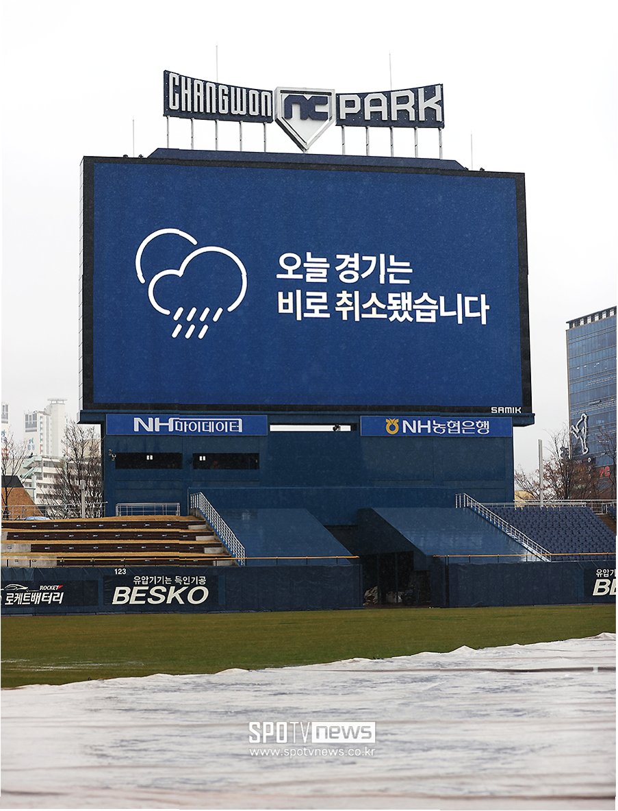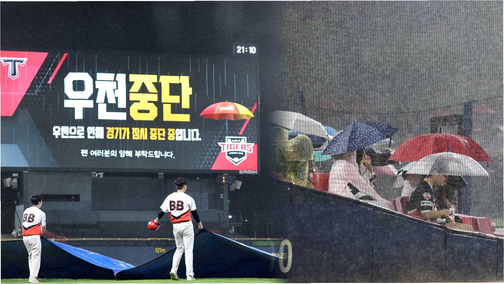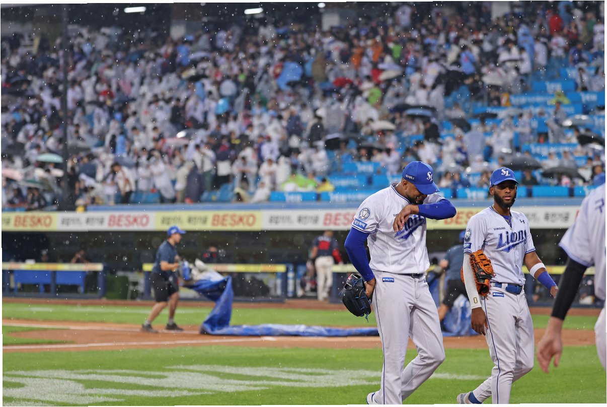 비가 쏟아지면서 그라운드는 빠르게 물바다가 되었고, 더그아웃까지 침수되는 상황이 발생했습니다. 대형 방수포가 깔리며 경기를 재개할 수 있을 것이라는 희망이 잠시 있었지만, 비는 그칠 기미를 보이지 않았습니다. 심판진은 30분이 경과한 후, 경기 속개가 불가능하다고 판단하고 우천 취소를 선언했습니다. 일부 팬들은 경기 중단에 아쉬움을 표하며 관중석을 떠나지 못했습니다.