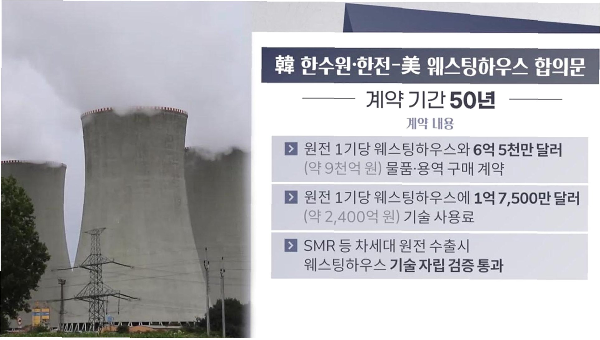 A.언론 보도에 따르면, 한수원이 원전을 수출할 때마다 웨스팅하우스 측에 기술 사용료 명목으로 2,400억 원을 지급하고, 9,000억 원 규모의 물품 및 용역 구매 계약을 제공해야 합니다. 이는 수출 원전 1기당 1조 1,400억 원을 웨스팅하우스에 지급하는 셈이며, 협정 유효 기간은 50년입니다.