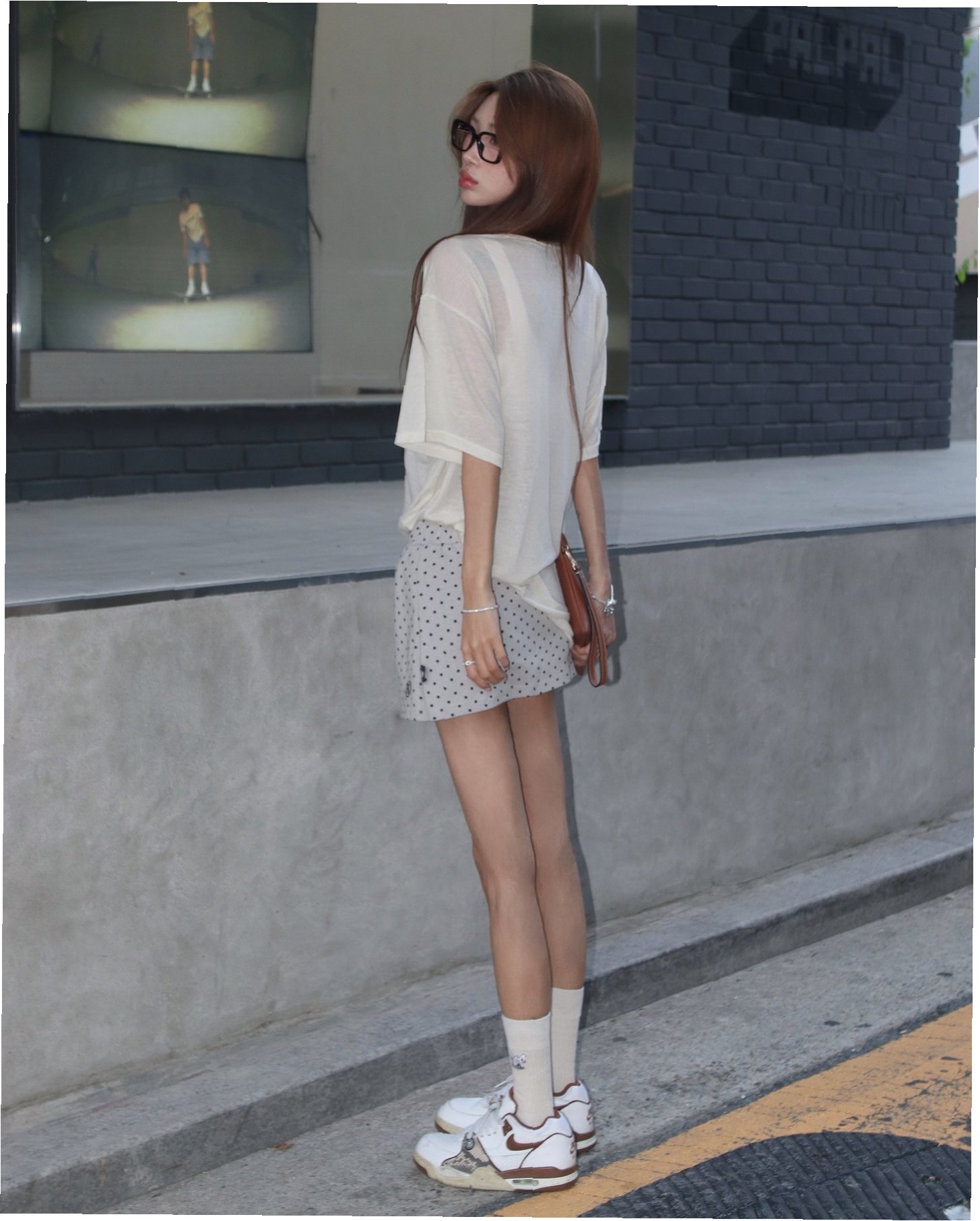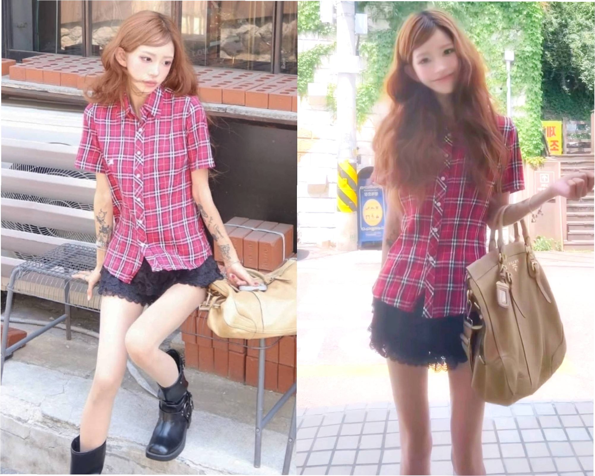 이번 스트리트컷은 카페 앞 골목길을 배경으로 한 패션 필름의 스틸컷을 연상시킵니다. 특히 내추럴한 컬러감의 베이지 빅백은 전체적으로 레트로한 무드를 더하면서도 과하지 않은 밸런스를 유지해 주목받고 있습니다. 웨이브 스타일의 붉은빛 헤어는 그녀의 도도한 분위기와 완벽하게 어우러져 눈길을 사로잡습니다.