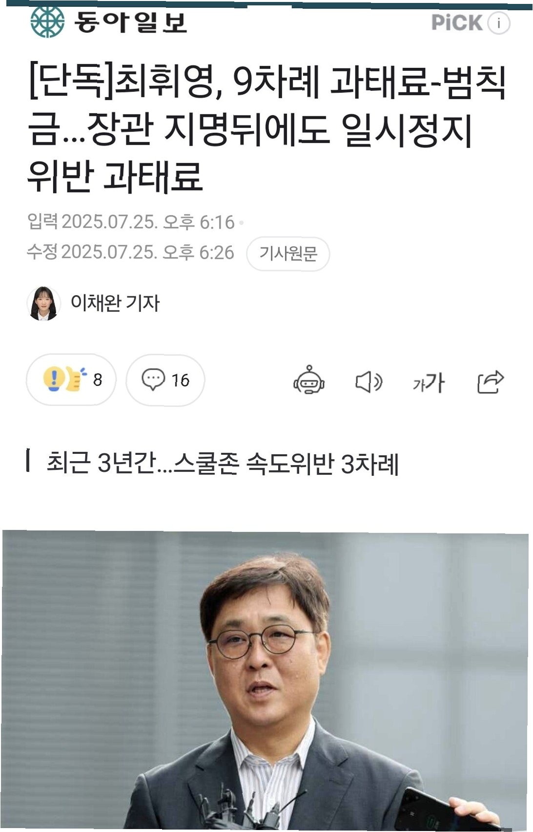 최휘영 후보자, 잦은 법규 위반으로 도덕성 논란