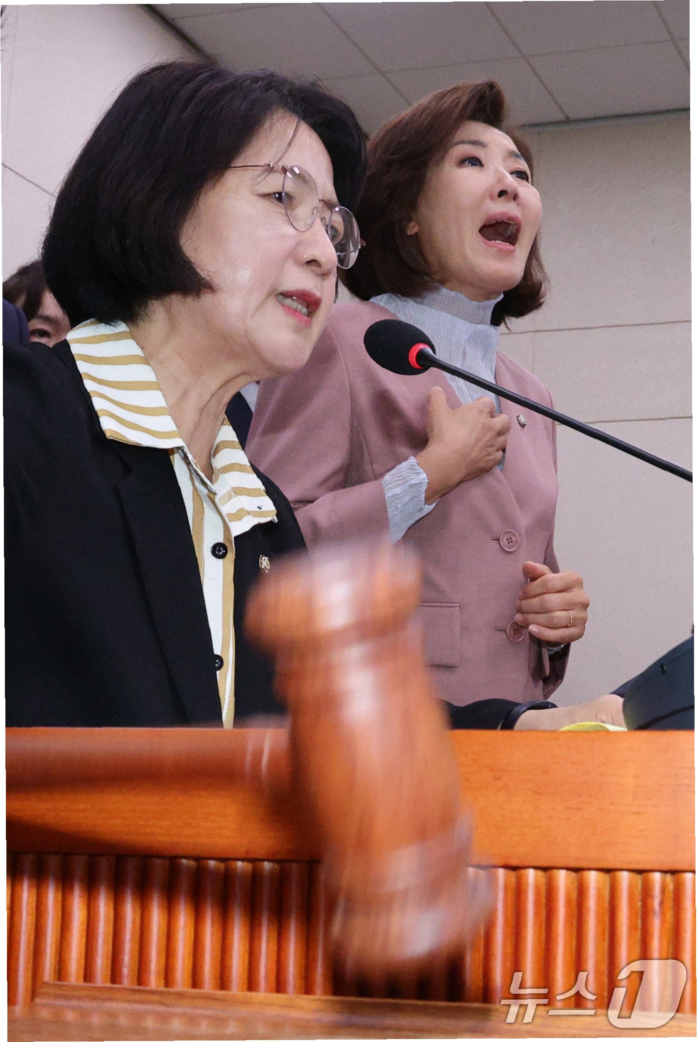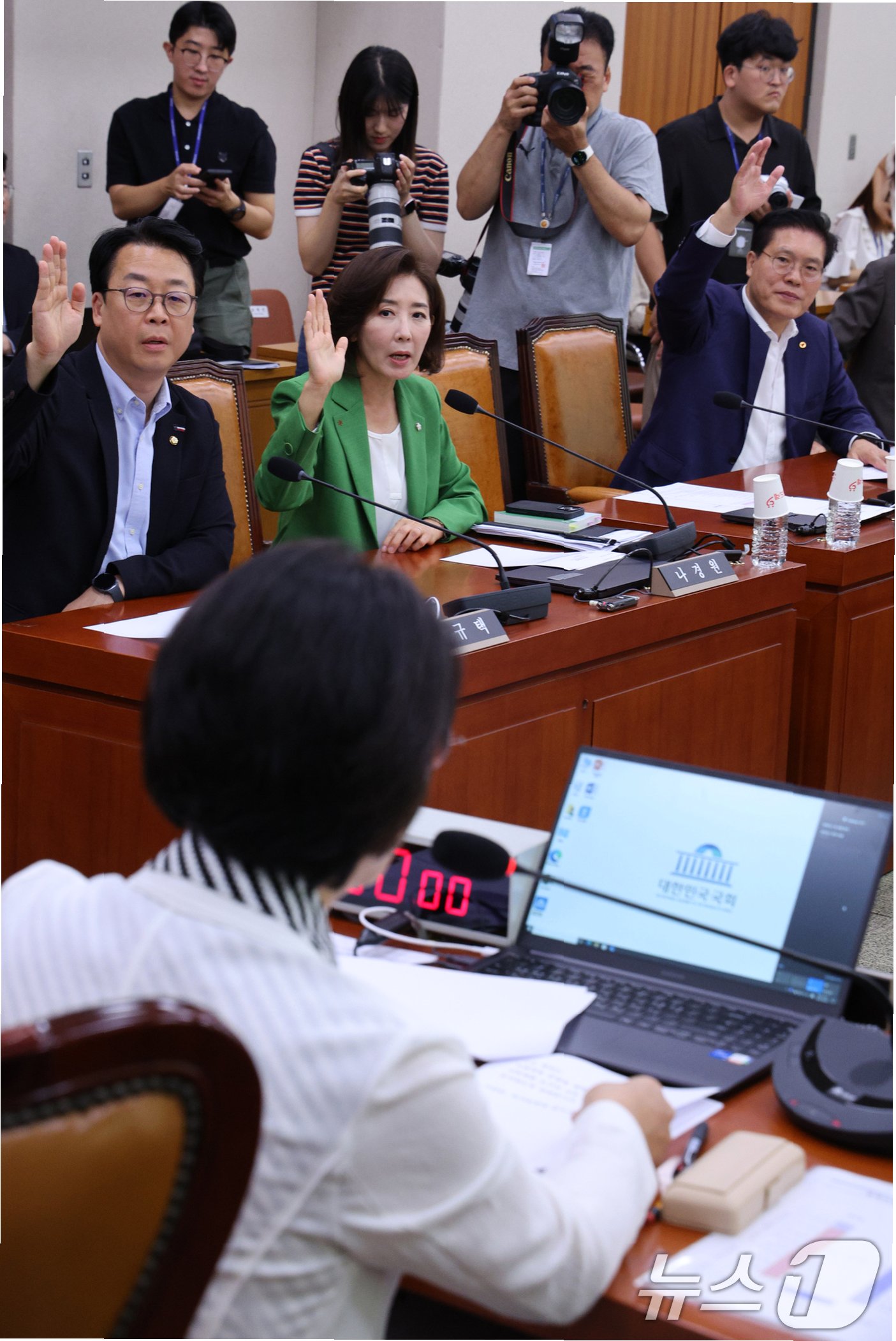 국민의힘은 추미애 위원장의 회의 운영 방식을 강하게 비판하며, 민주당이 법사위를 '가짜뉴스 공장'으로 만들었다고 주장했습니다. 나경원 의원은 '건진법사 관봉권 띠지 사건' 등을 언급하며, 진실을 회피하려는 저급한 정치 공작이라고 비난했습니다. 송석준 의원은 추 위원장을 '추할 추'에 비유하며 비판의 강도를 높였습니다.