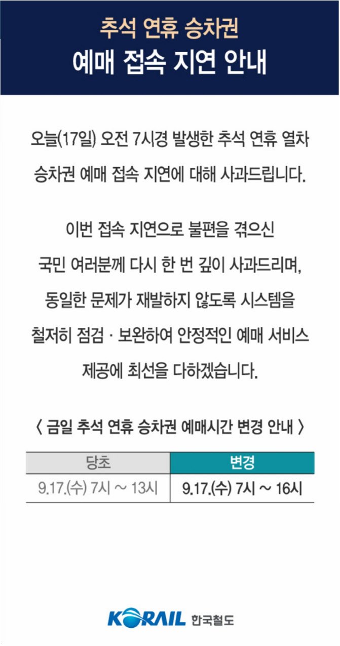 A.평소보다 많은 예매객이 몰리면서 시스템에 과부하가 걸렸기 때문입니다. 지난해 추석 연휴보다 72%나 급증한 예매 이용객 수가 영향을 미쳤습니다.